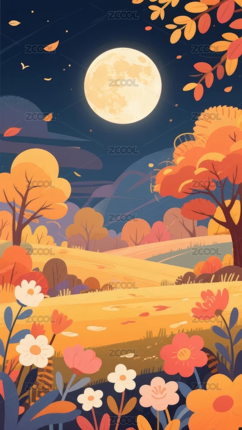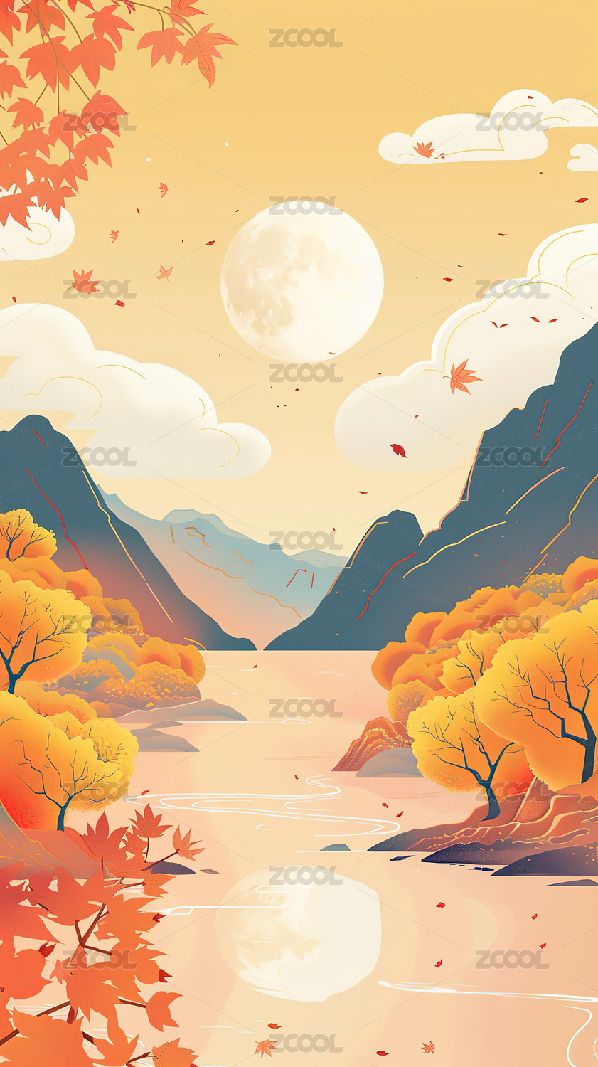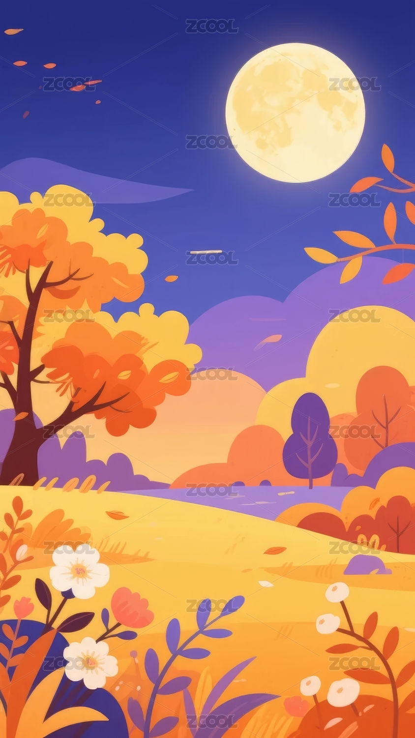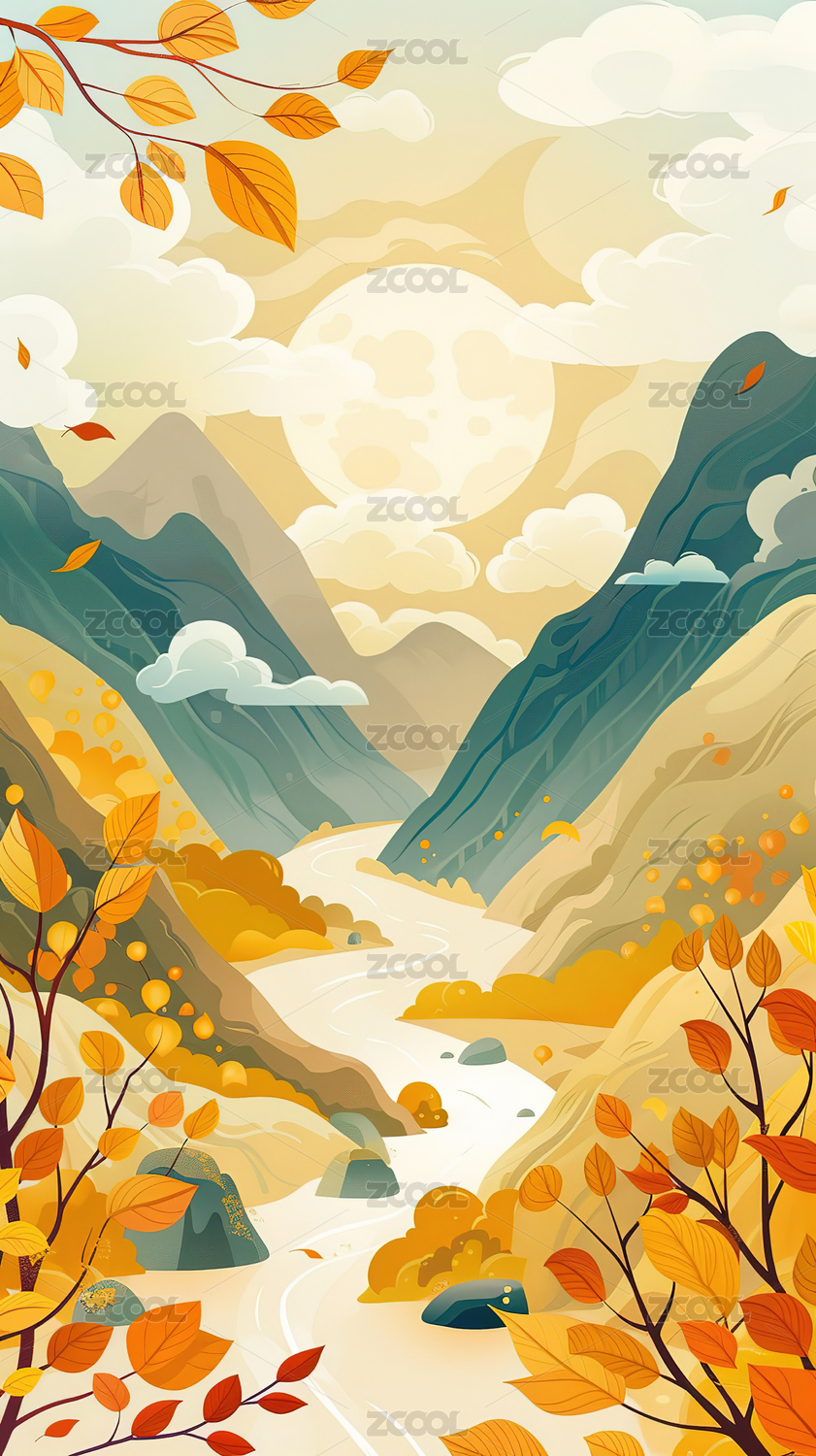 秋天扁平插画蓝天白云树木落叶壁纸竖版