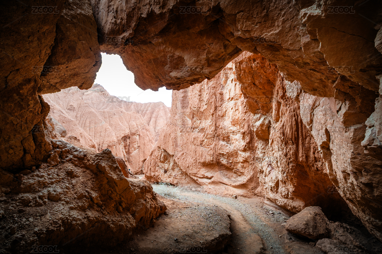 中国新疆吐鲁番火云谷峡谷石窟洞口风光