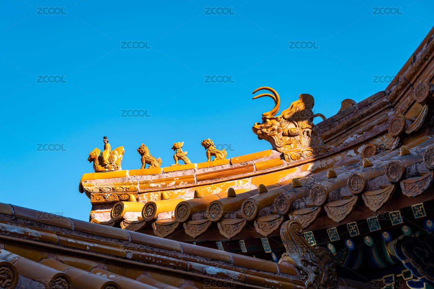 蓝天背景下的北京颐和园宫殿屋脊神兽