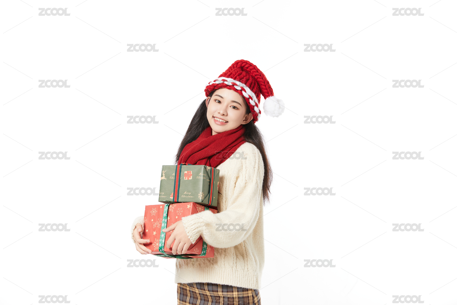 穿着白色毛衣短裙的女孩抱着圣诞礼物全身照