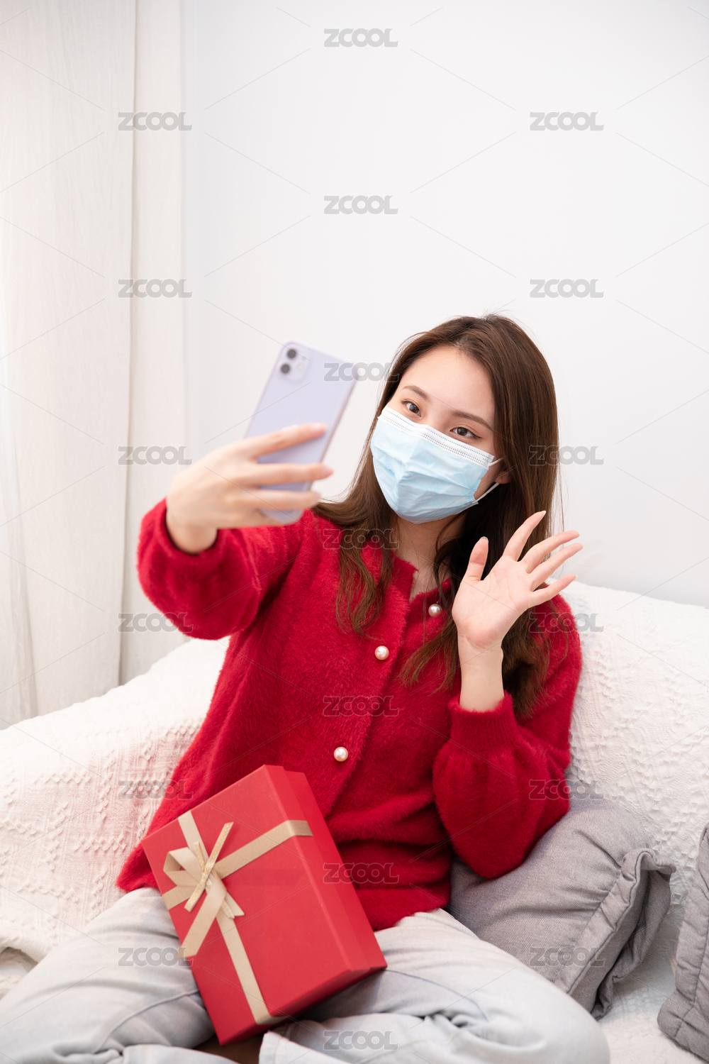戴着口罩拿着红包的年轻女孩正在视频聊天