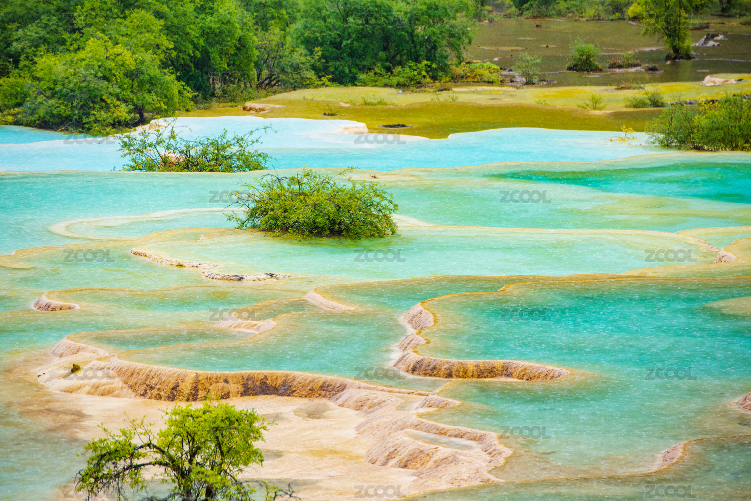 四川,黄龙,雨天,靛蓝,树木,瑶池,五彩池,彩池,水,地质
