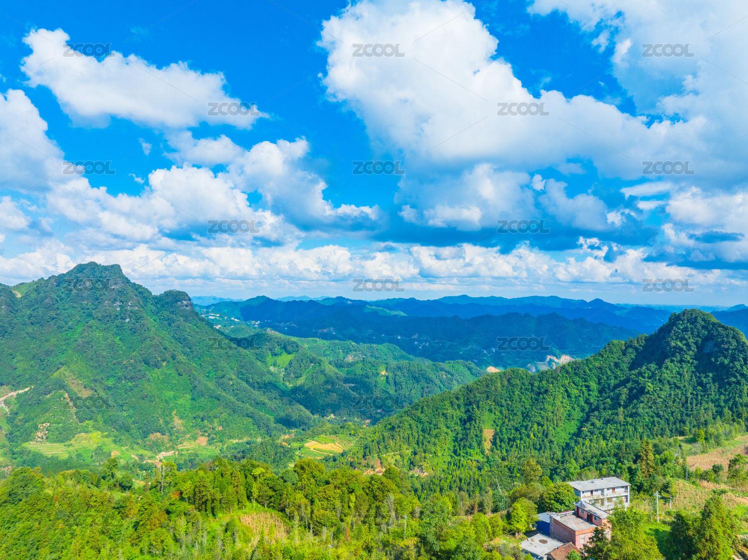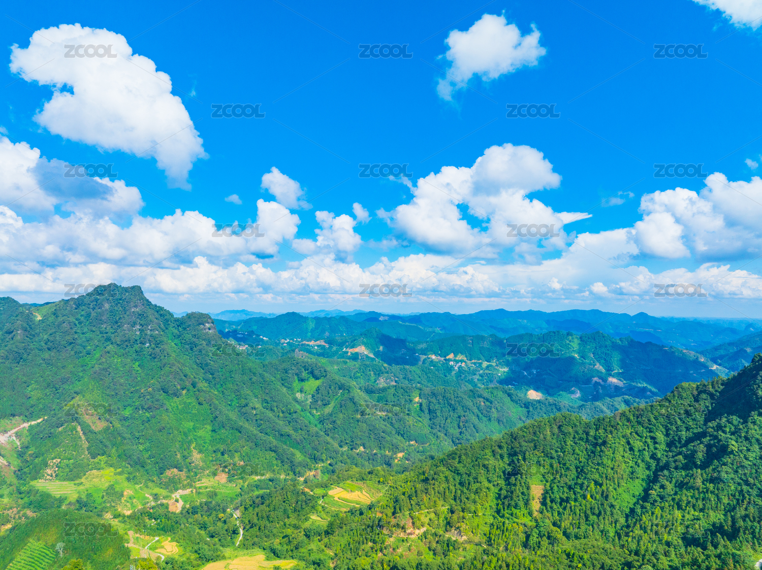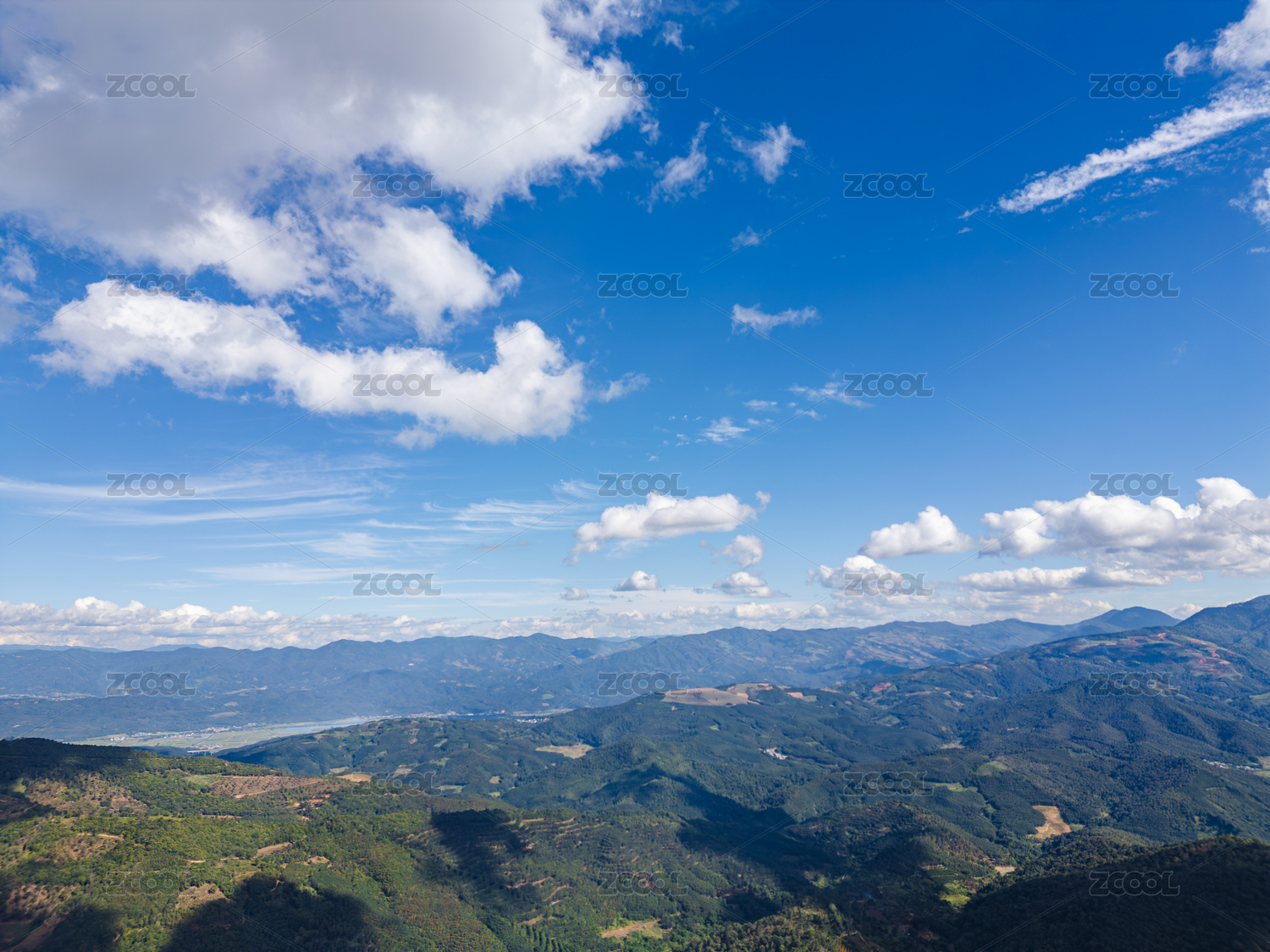 航拍蓝天白云下广阔无垠绿意盎然的山地景观