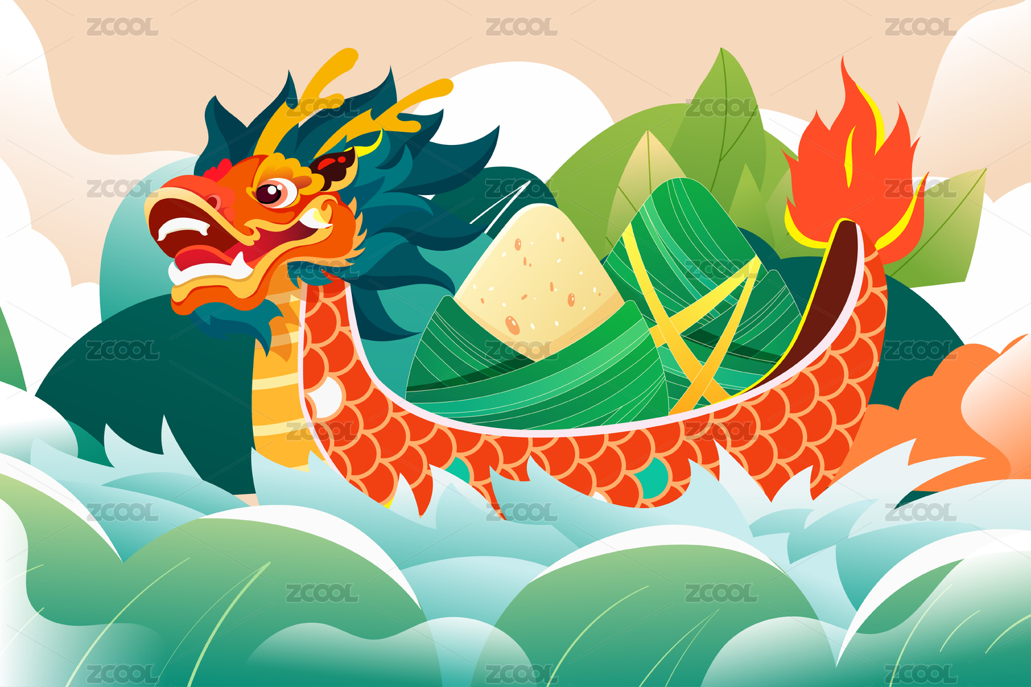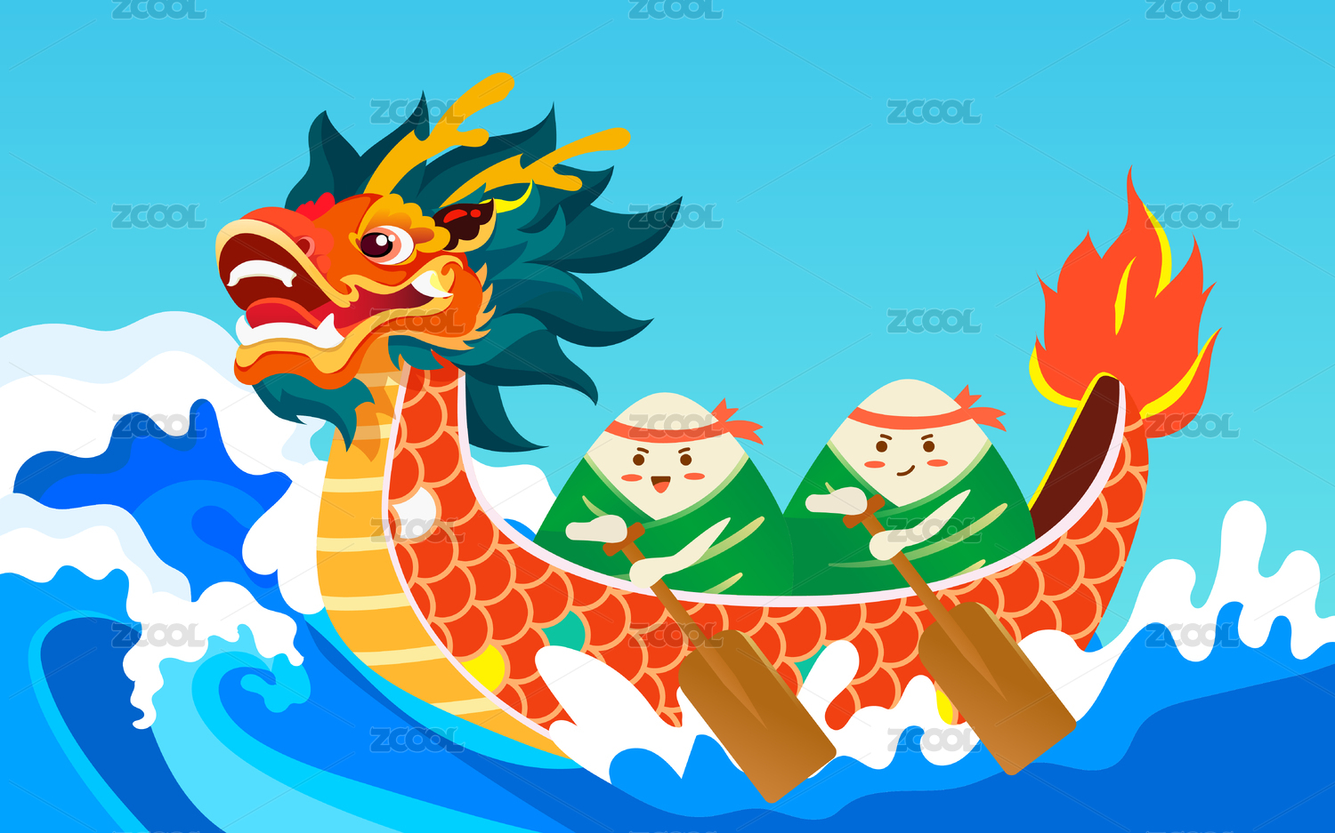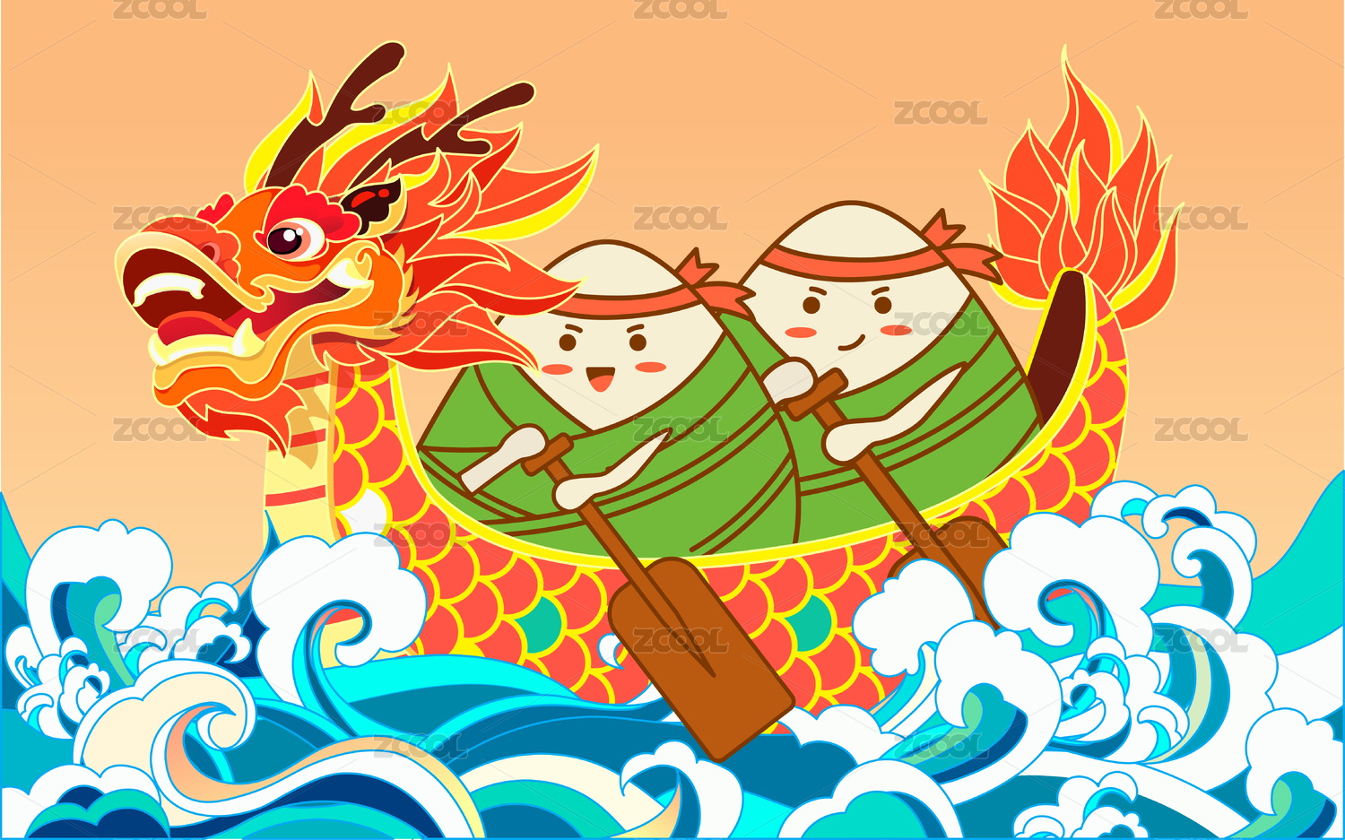 端午节划龙舟浪花插画传统国潮节日粽子海报
