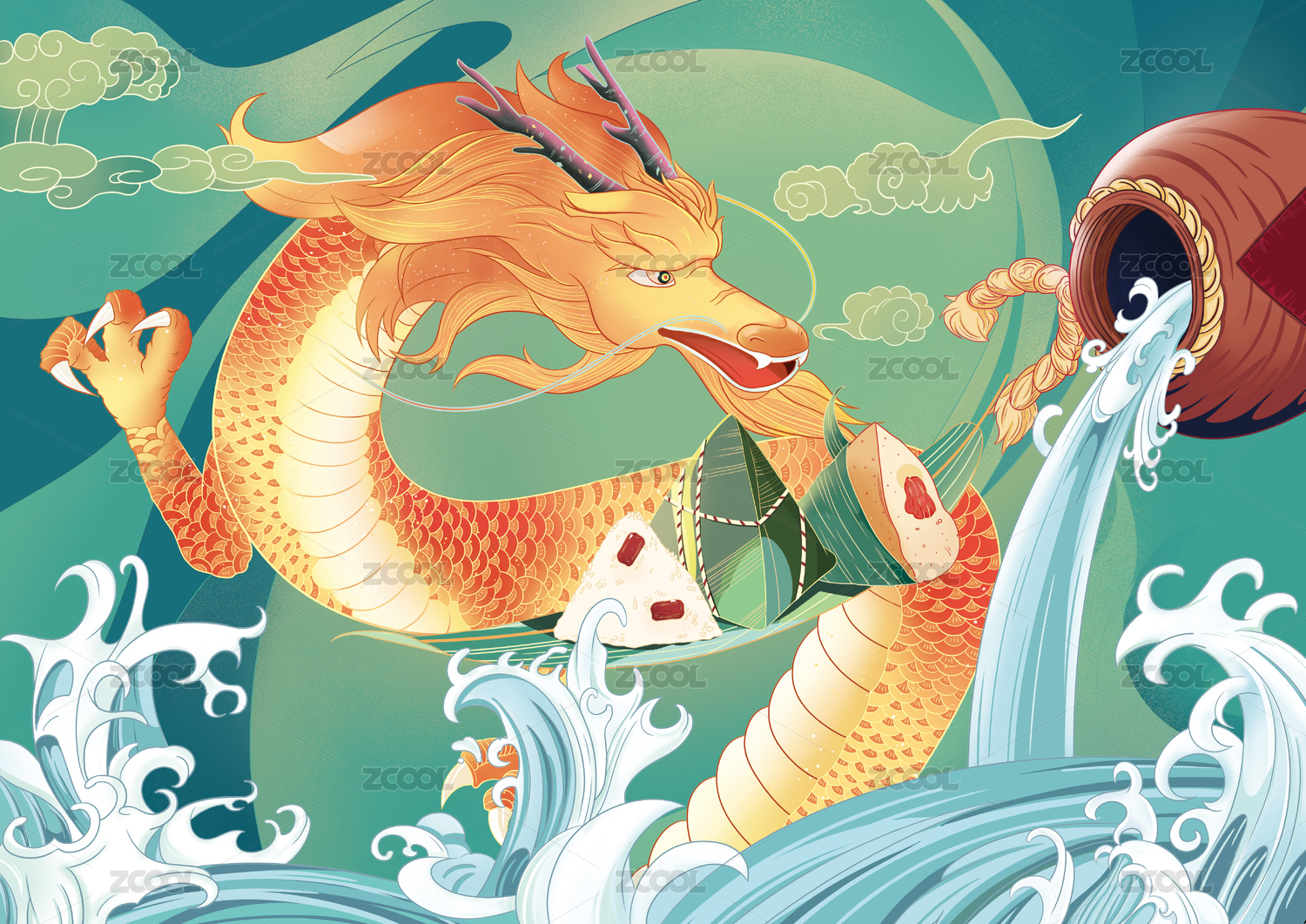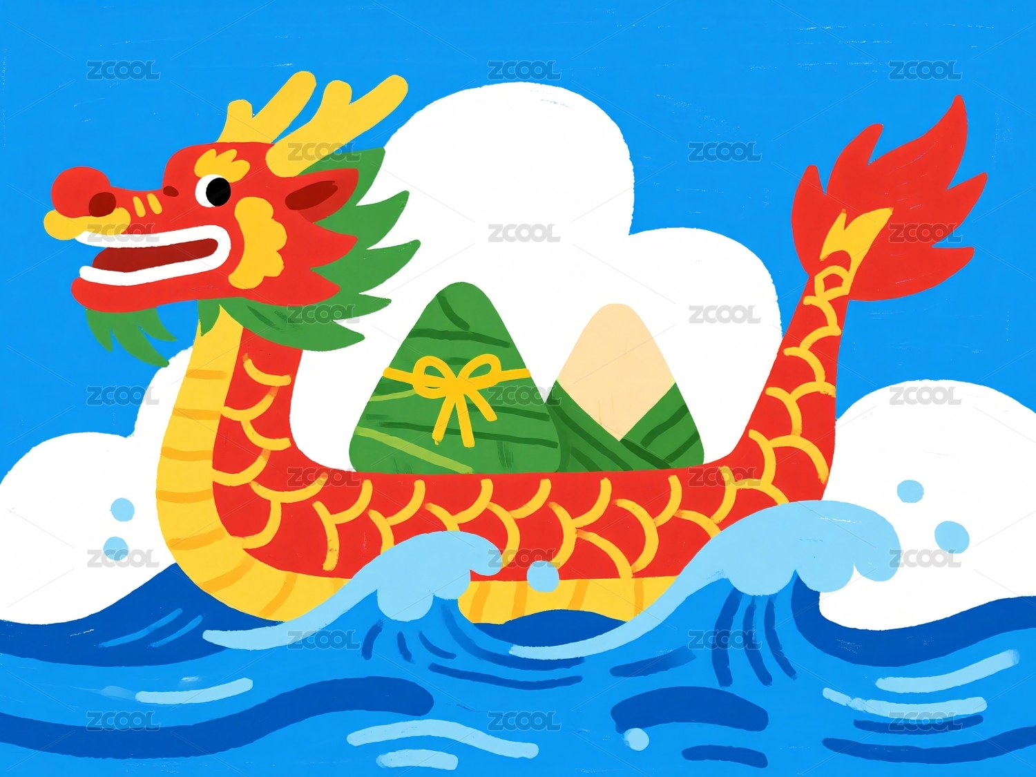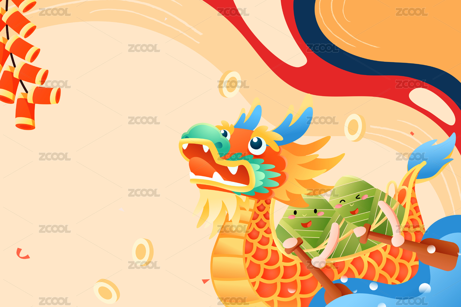 端午节划龙舟浪花插画传统国潮节日粽子海报