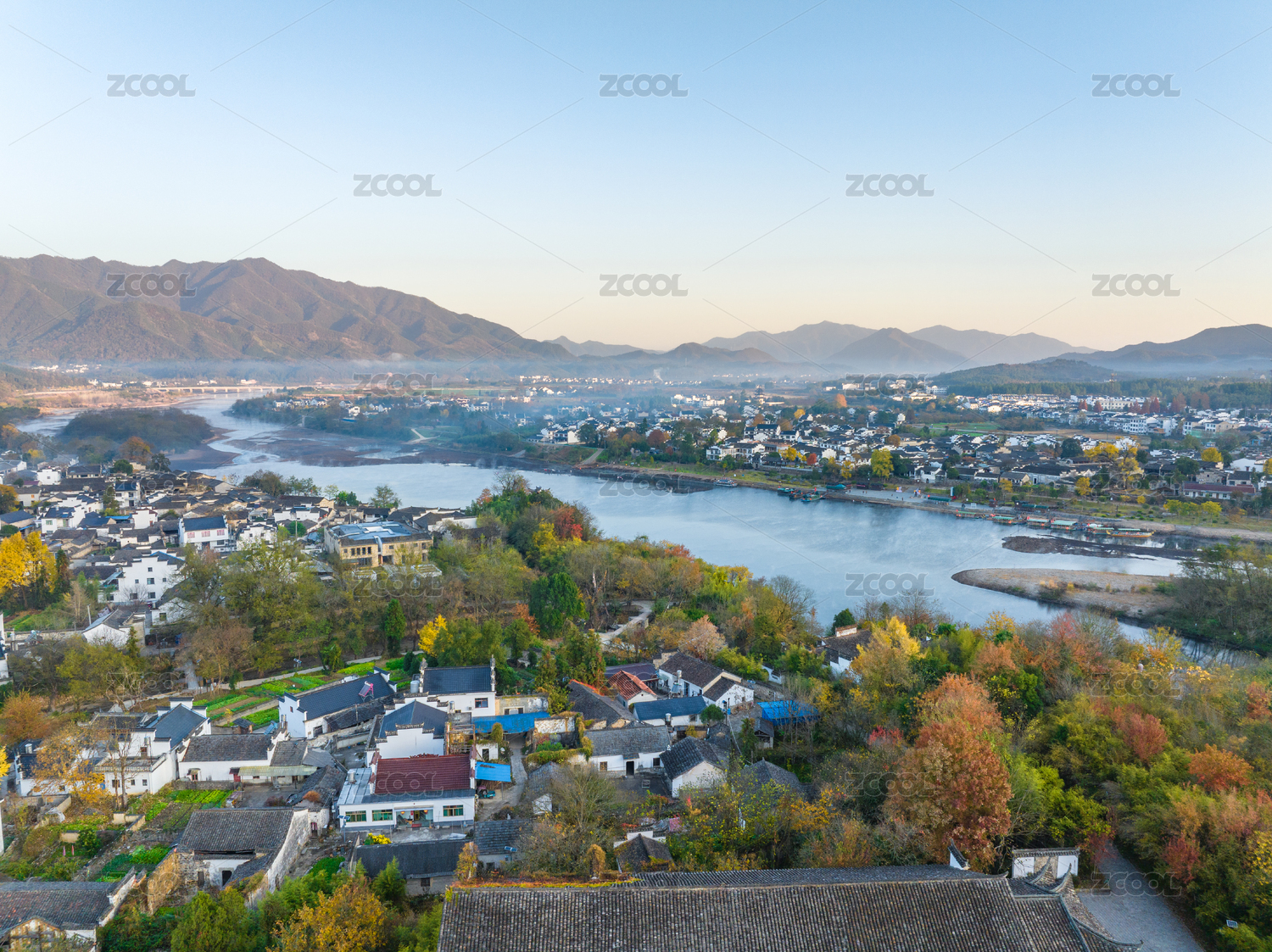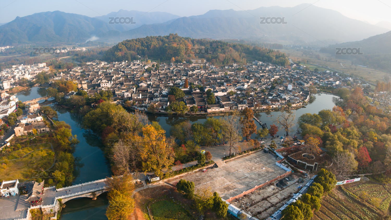 安徽黄山水墨江南宏村徽派建筑群秋色航拍