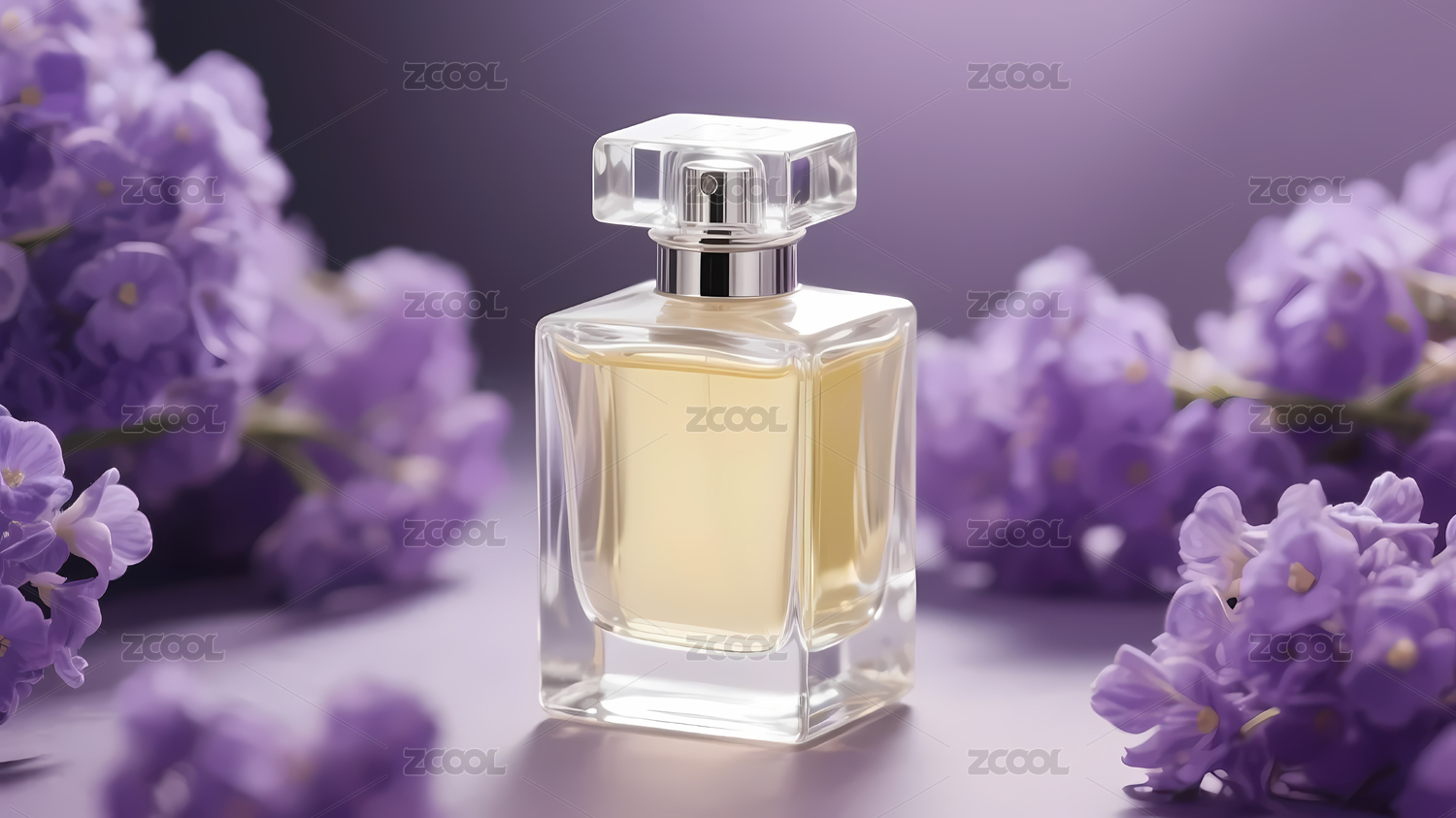 香水瓶置于紫色花丛中