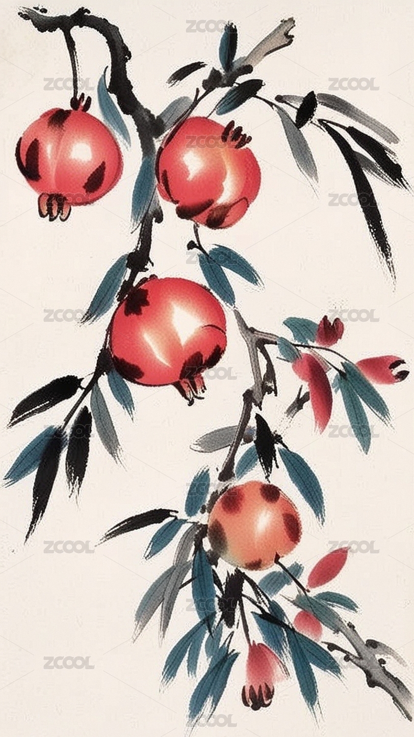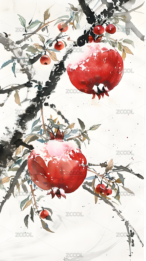 AIGCFG,中国风,水墨,插画,中式风格,水果,石榴
