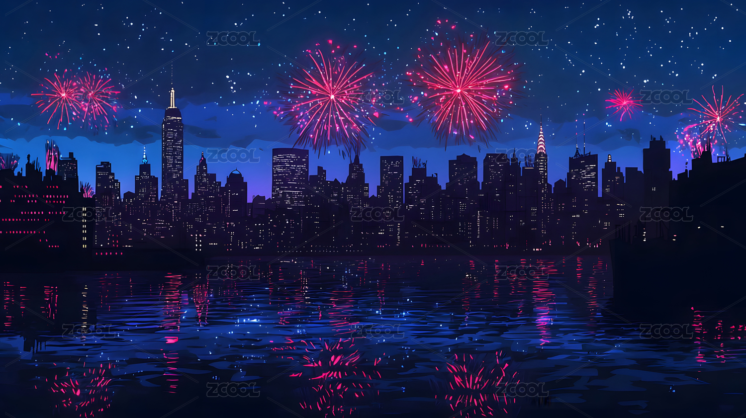 烟花,璀璨,绽放,背景,城市,天际线,节日,元旦,春节,元宵节