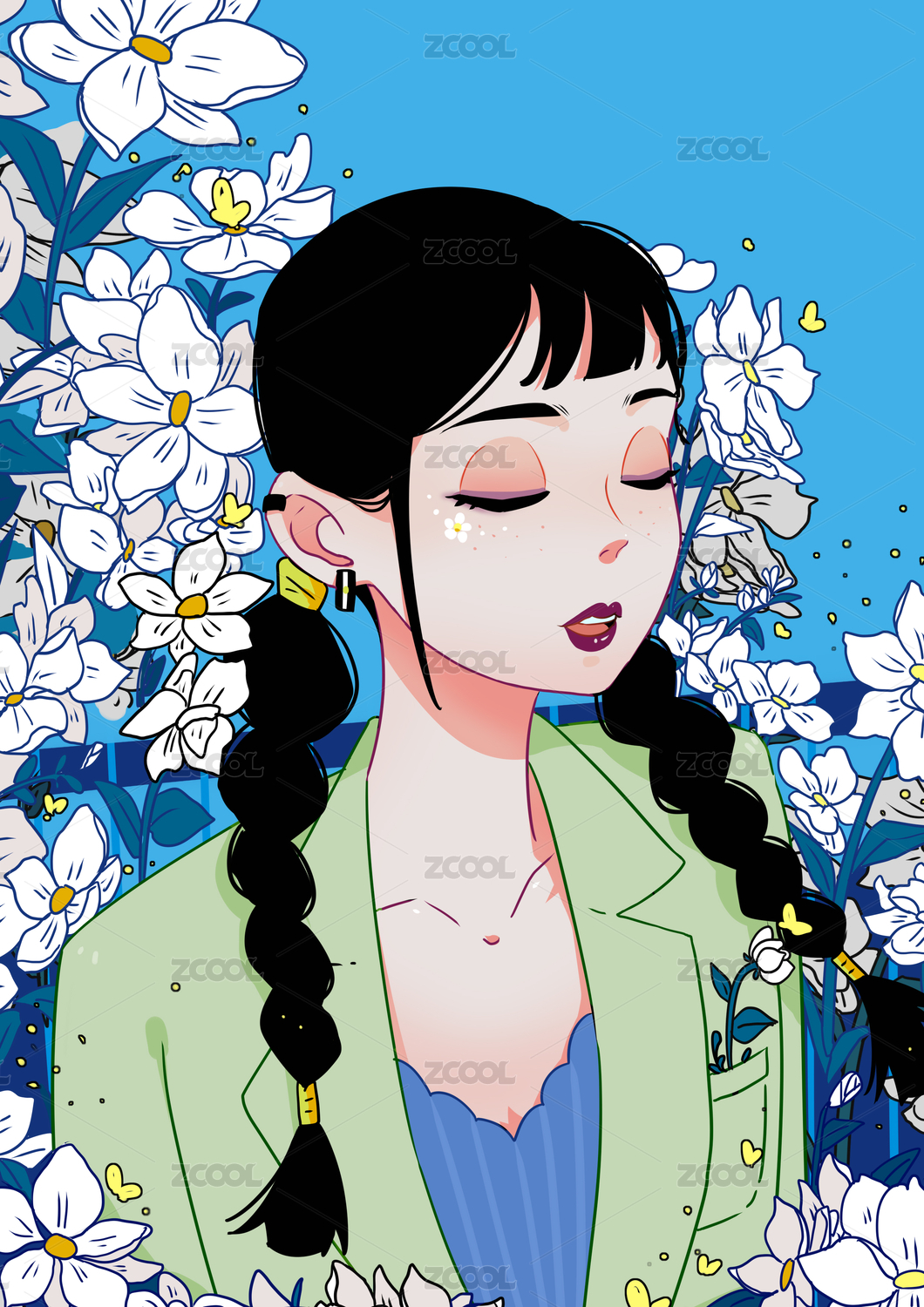 立秋夜晚在花园中闭眼闻花香的双马尾女生