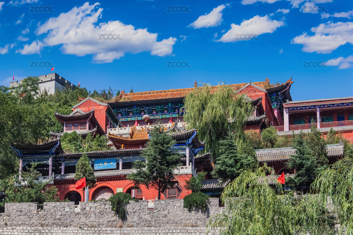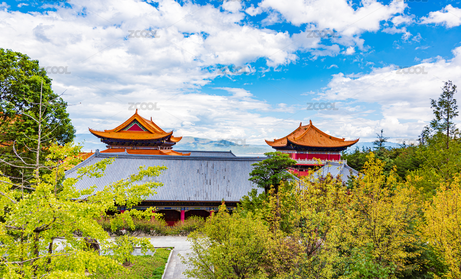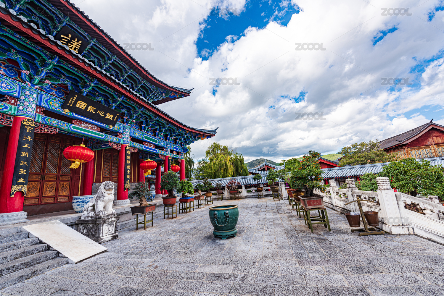 蓝天白云下的中国云南丽江古城木府建筑景观