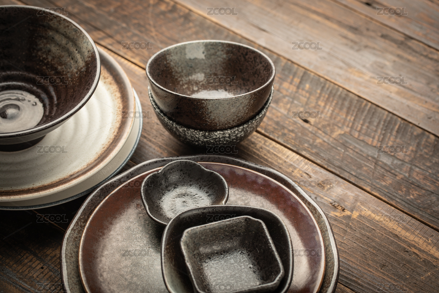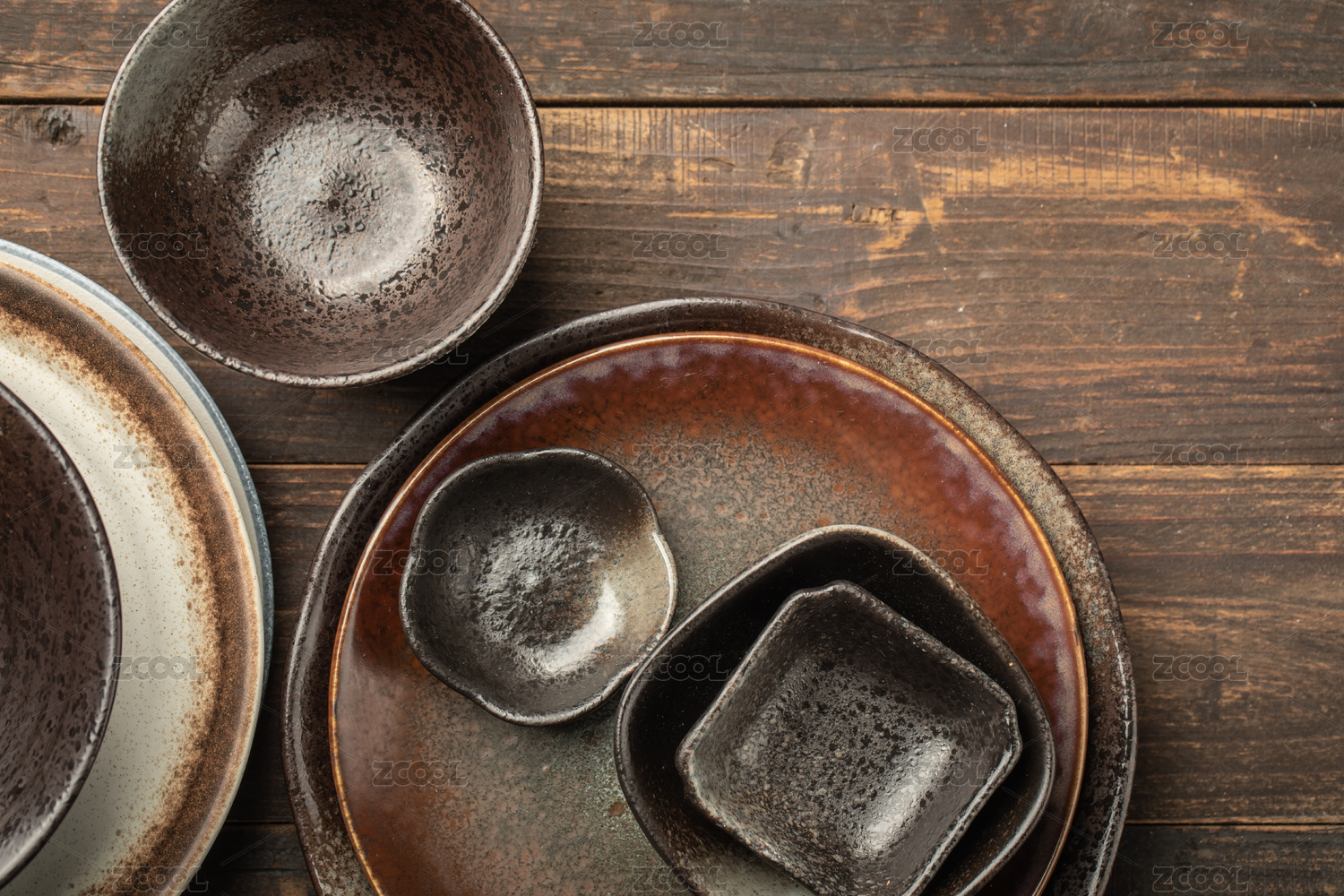 木制背景上的亚洲传统复古陶瓷餐具