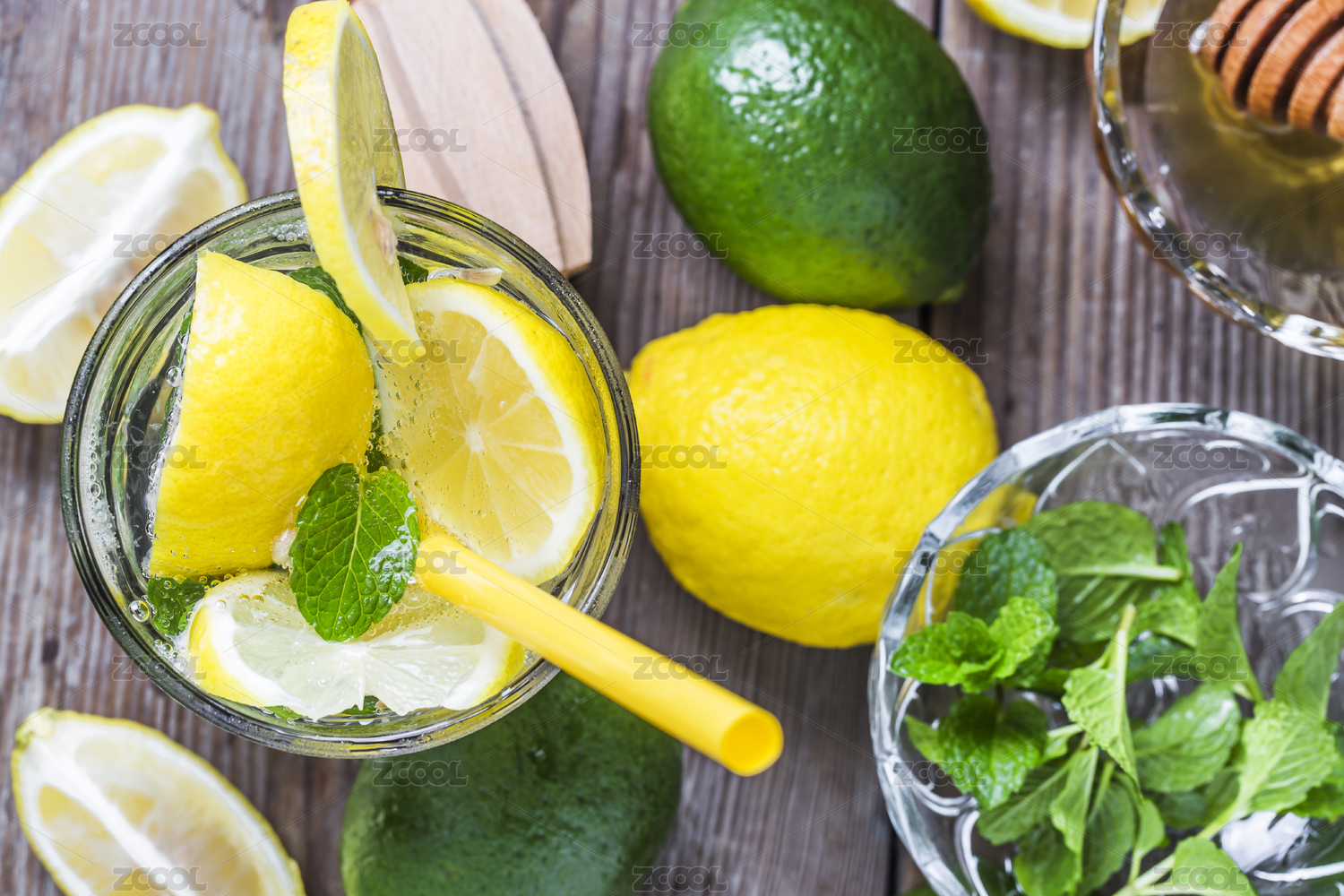 一杯新鲜的柠檬水和新鲜的柠檬、薄荷