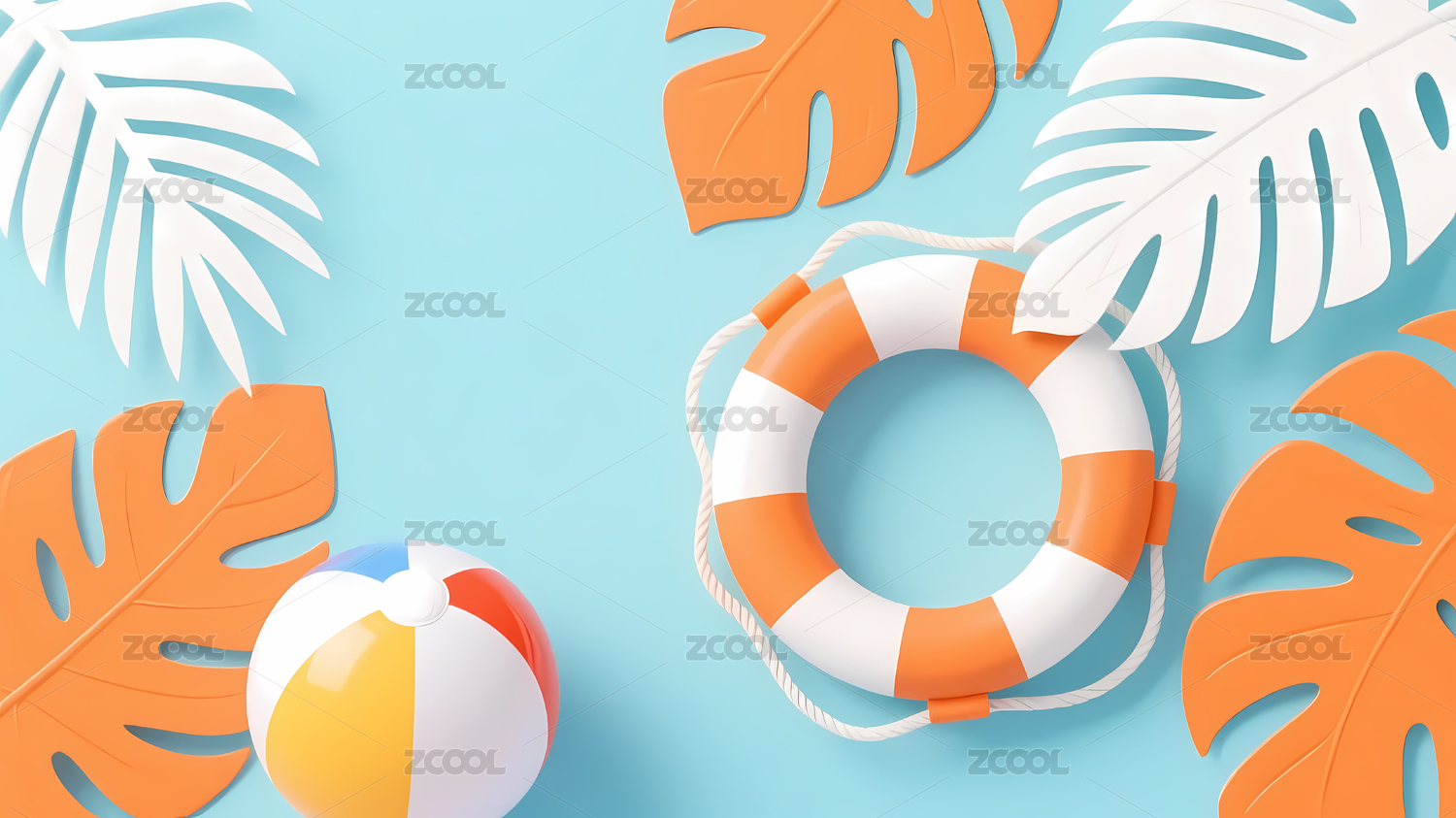 卡通风格的夏日海滩景观,带有救生圈和装饰