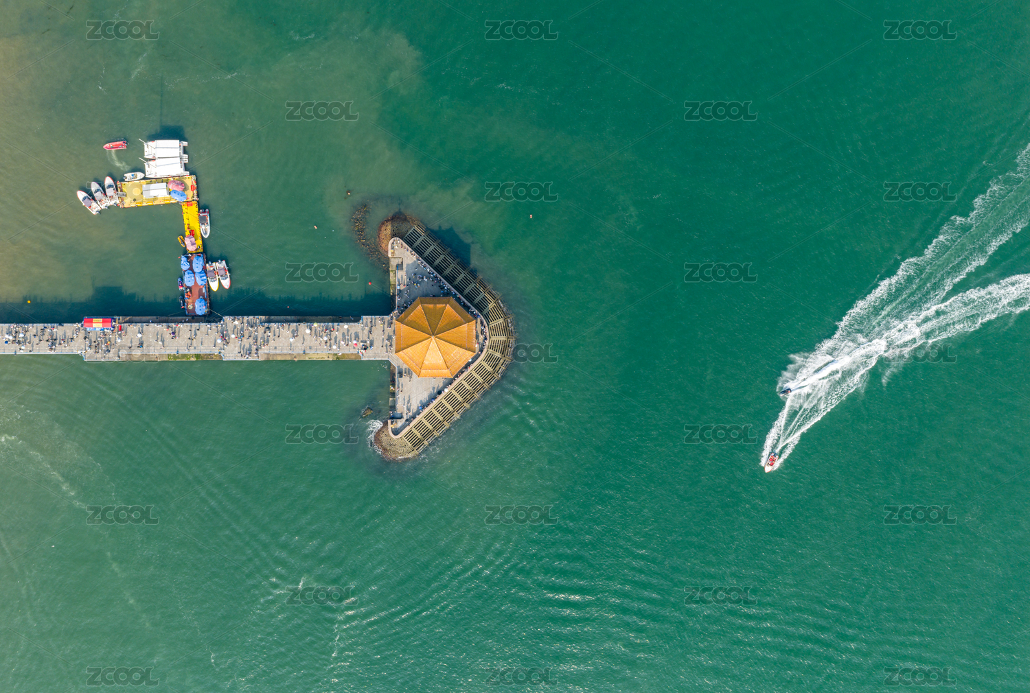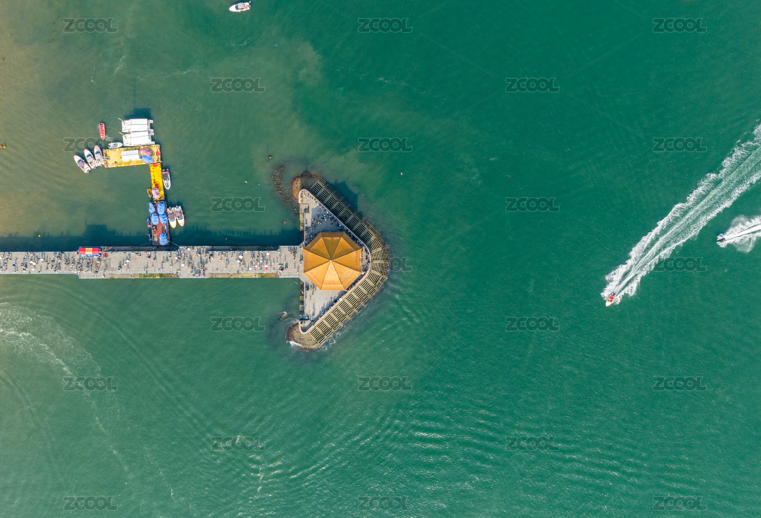 正上方视角航拍山东省青岛市海滨栈桥回澜阁
