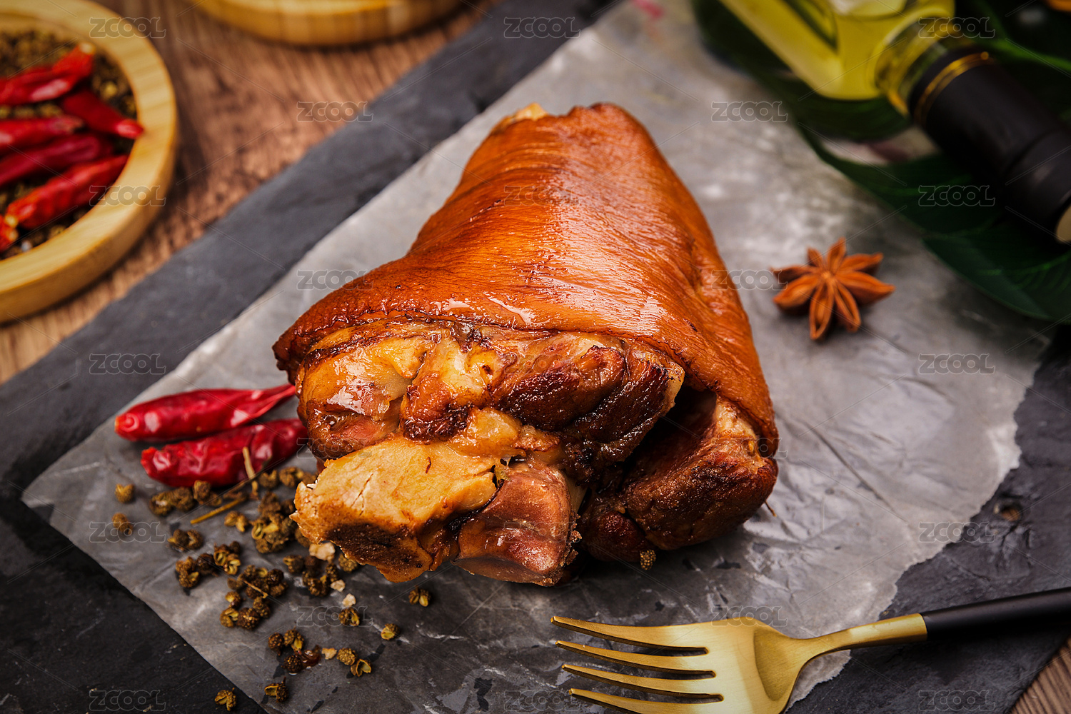 放在木质盘子上的香辣烤猪蹄