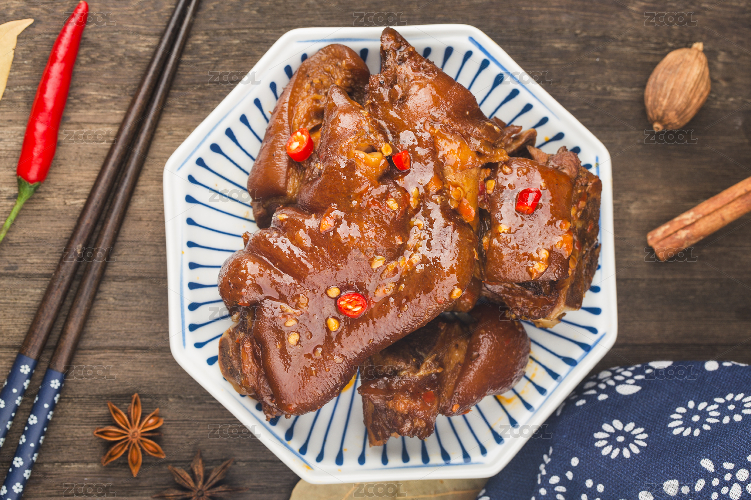 方格餐布上碟子里卤猪蹄猪脚