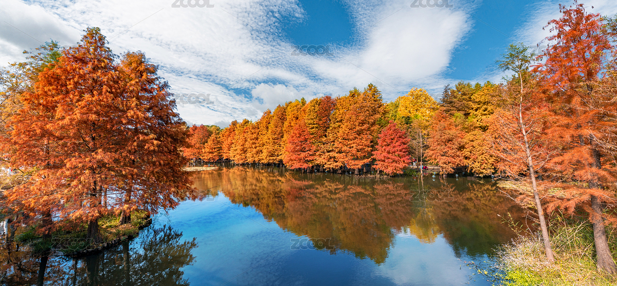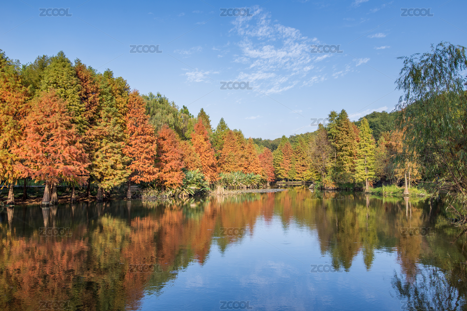 航拍南京紫金山下燕雀湖岸边的红色水杉