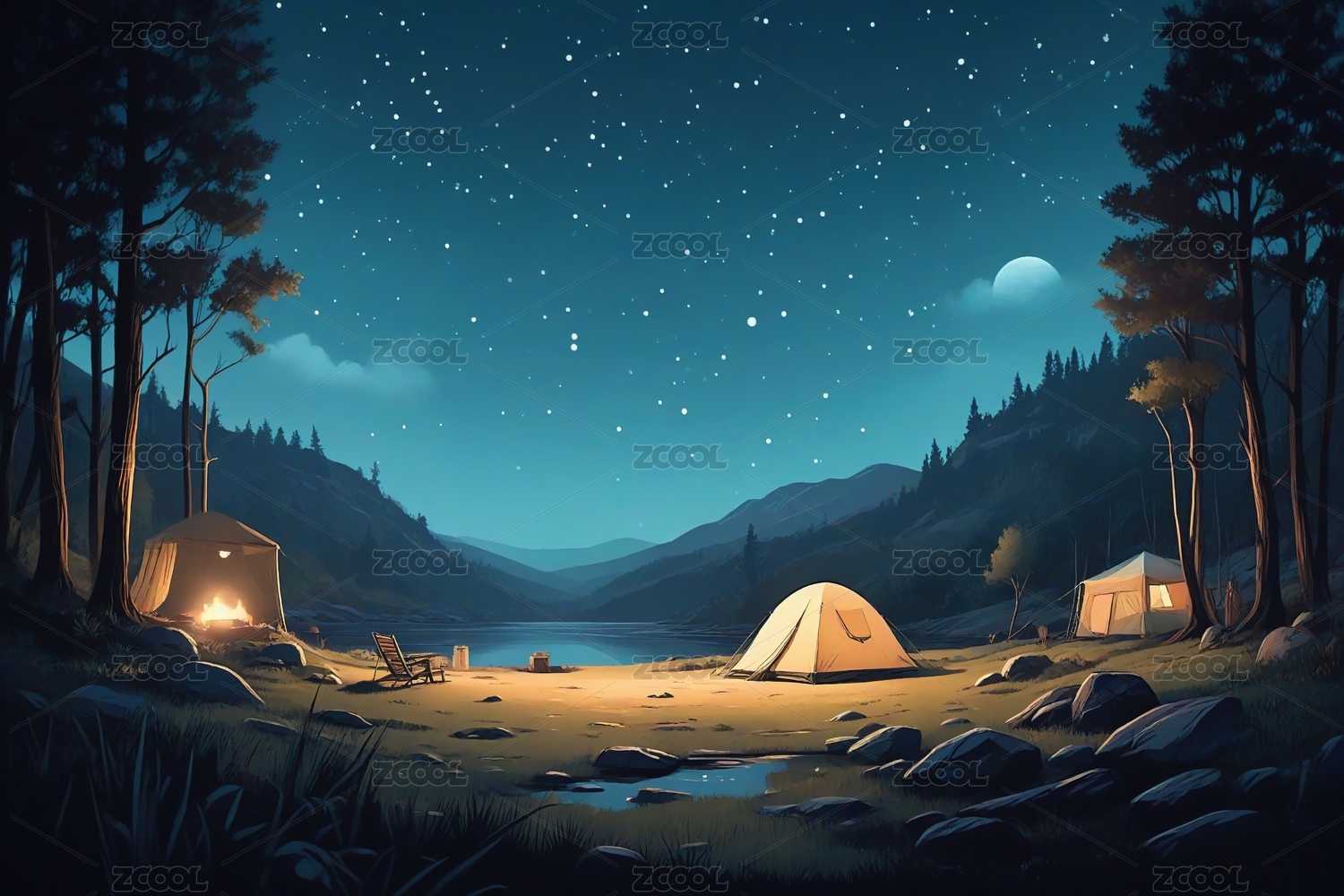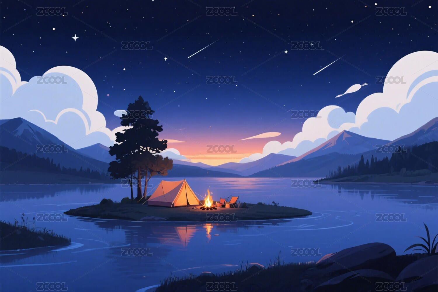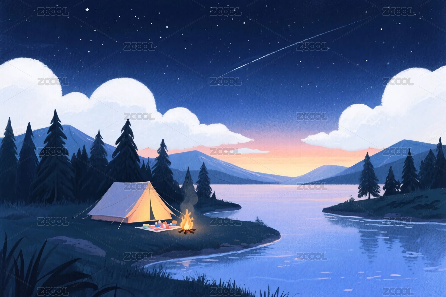 夏日露营插画:湖边的帐篷篝火萤火虫