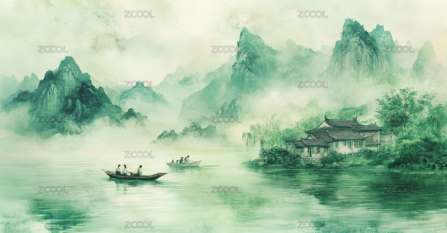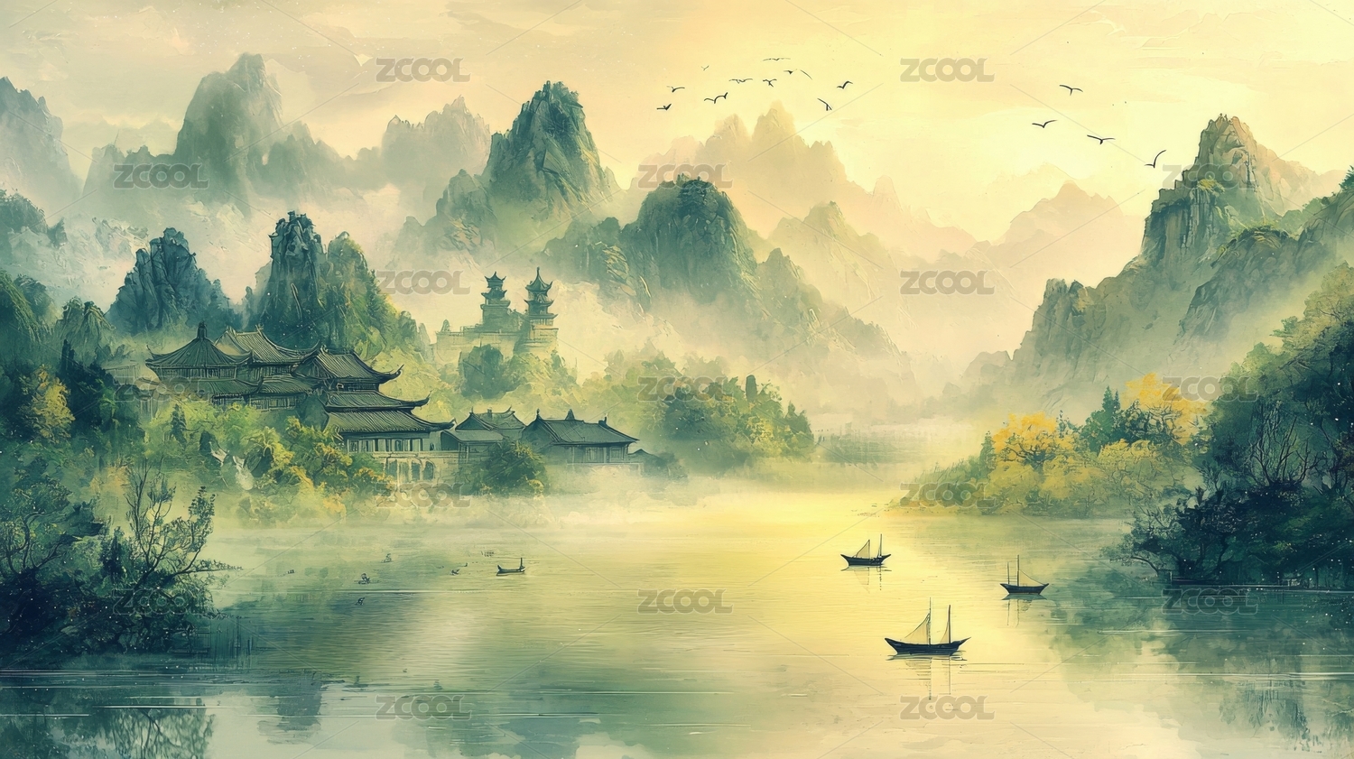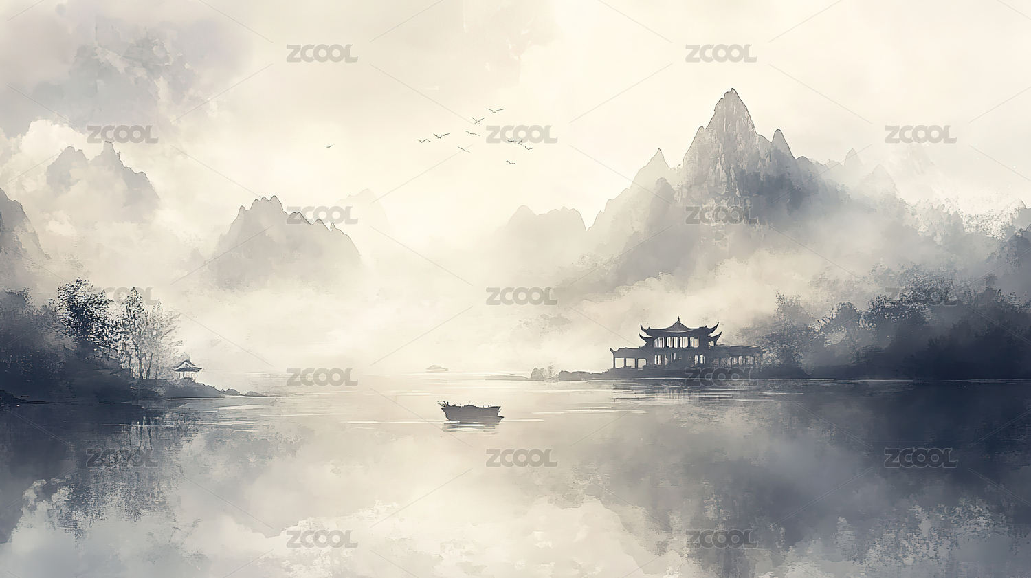 烟雨朦胧山水间古建筑与渔舟相映成趣