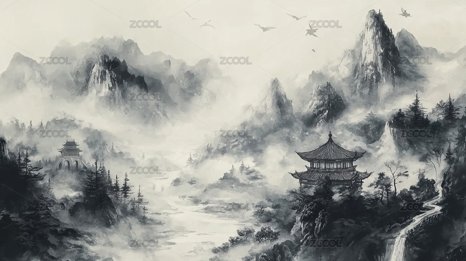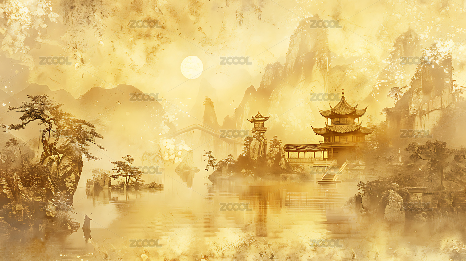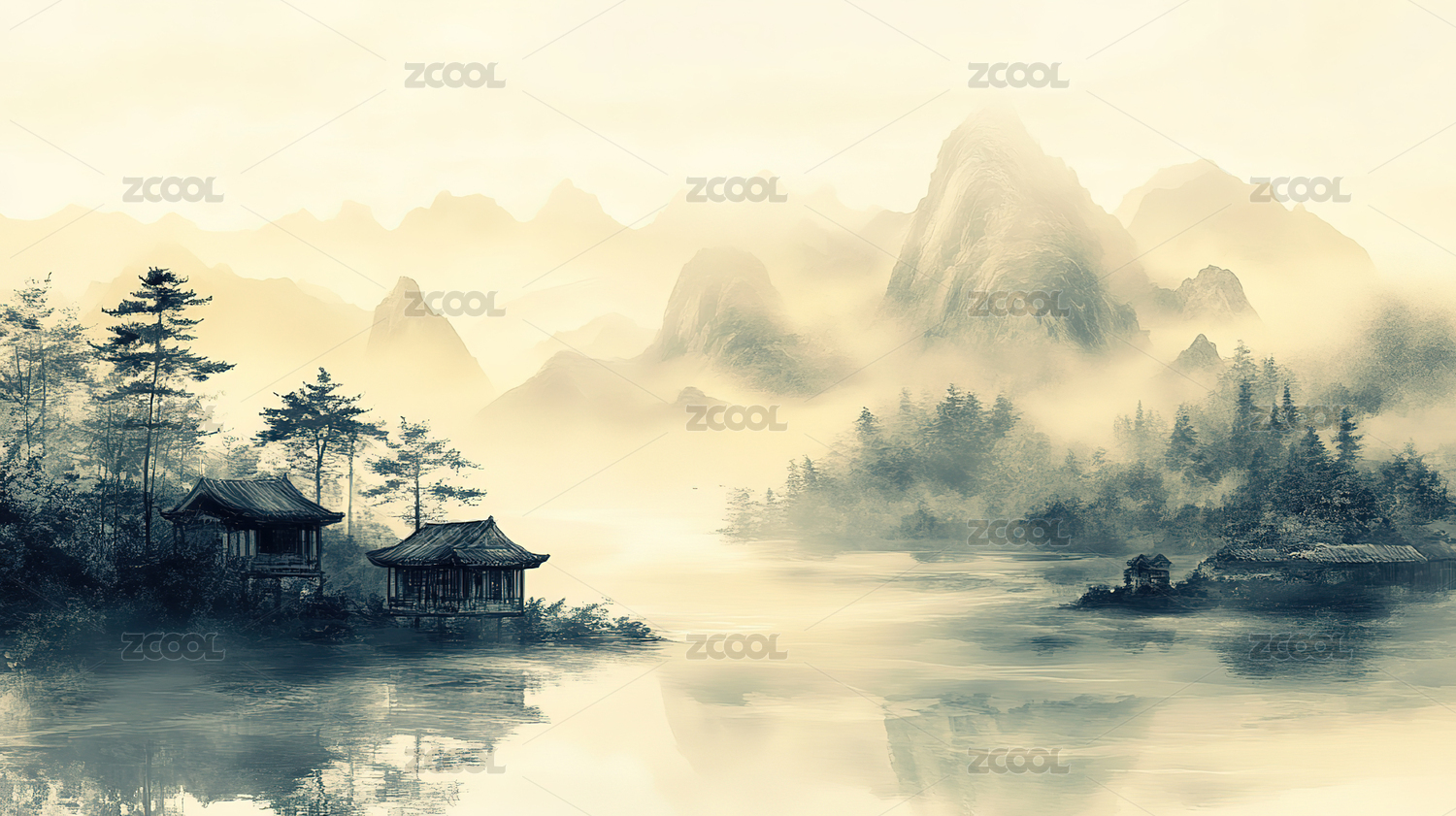 烟雨朦胧山水间古建筑与渔舟相映成趣