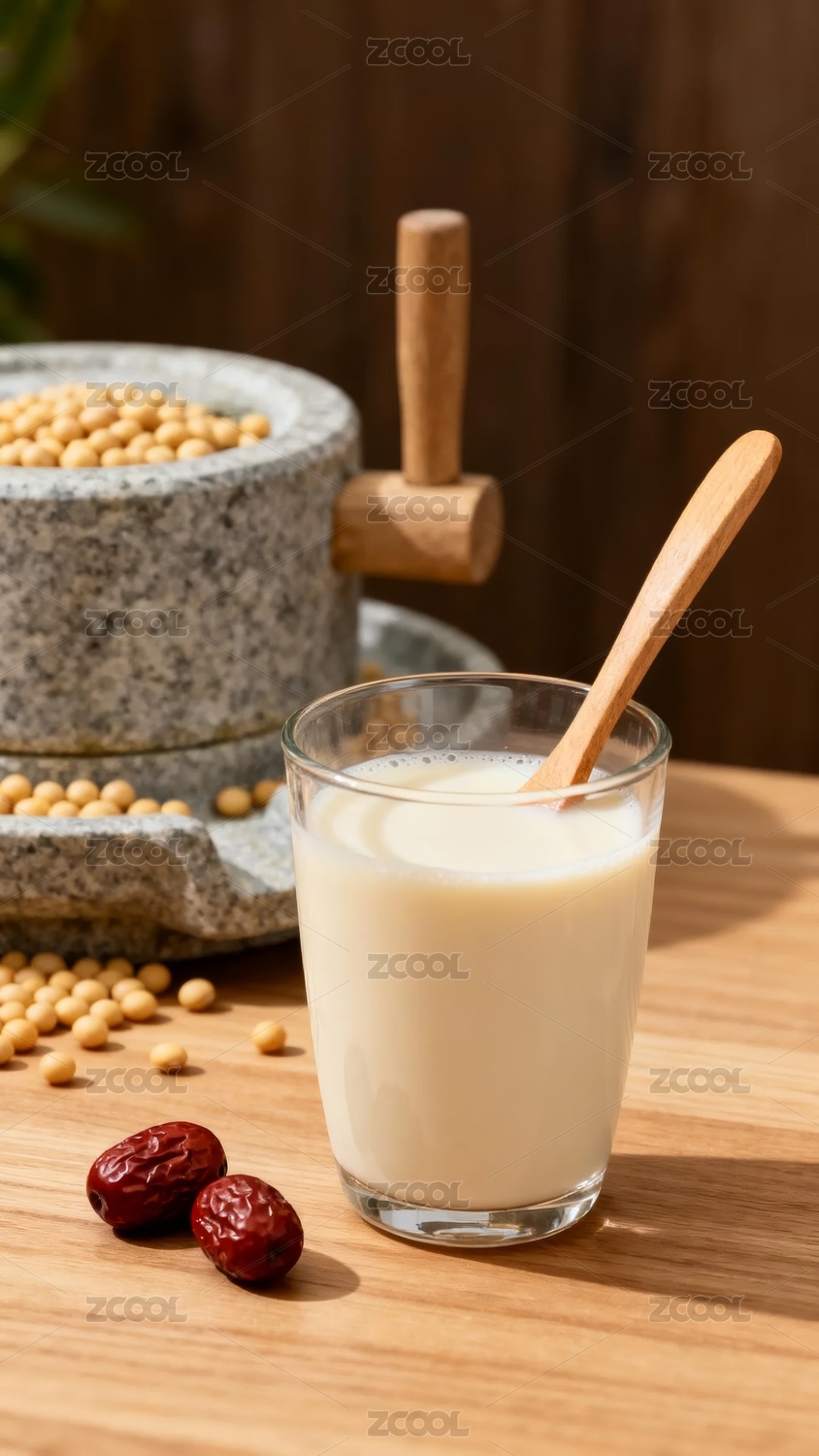 传统饮品 玻璃杯里的豆浆 背景放着黄豆