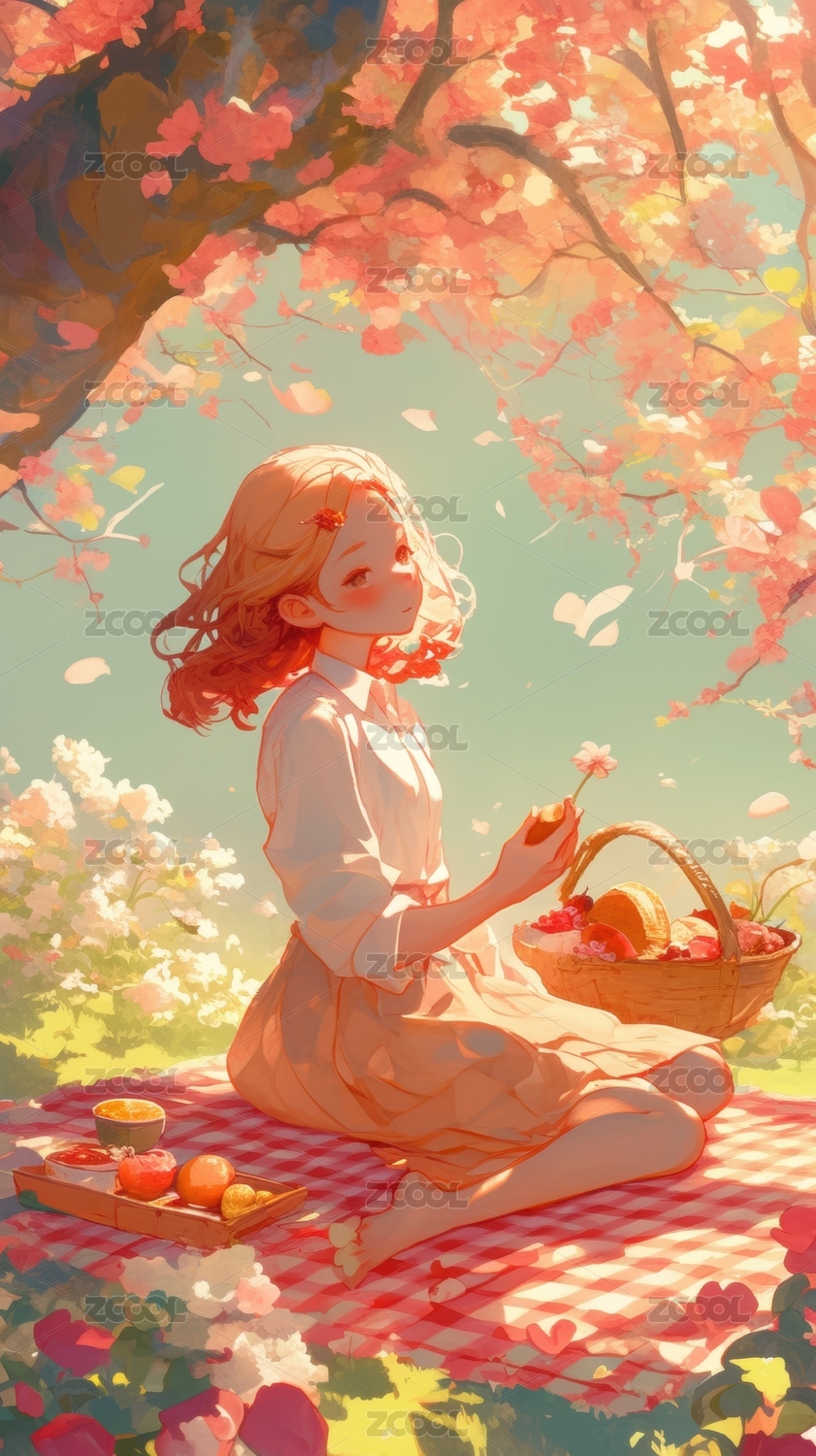 樱花树下少女野餐