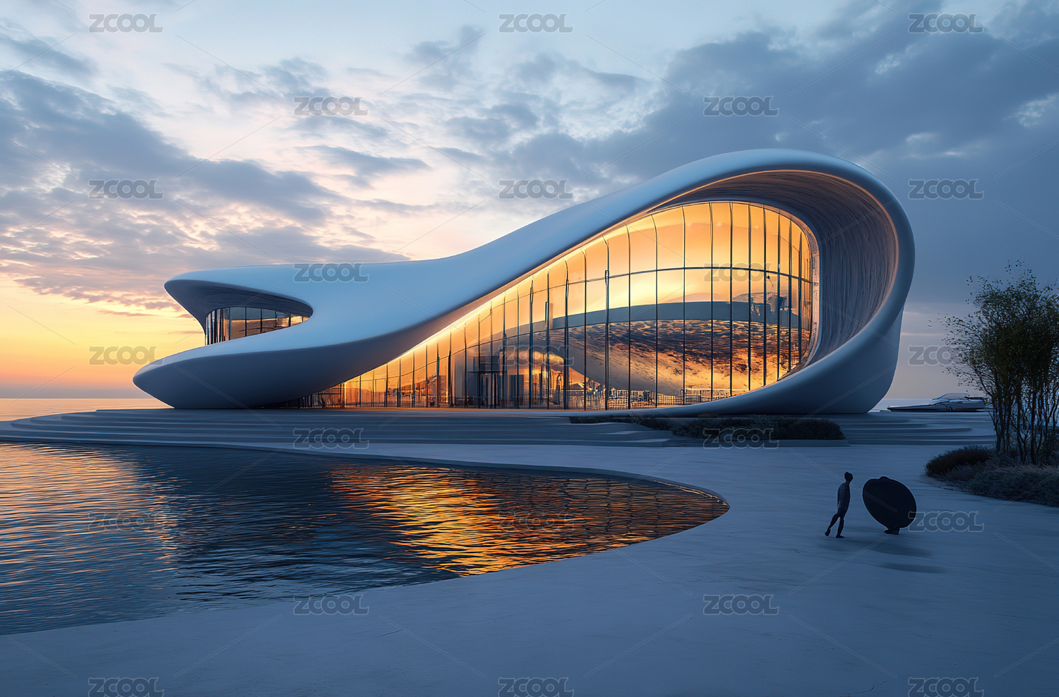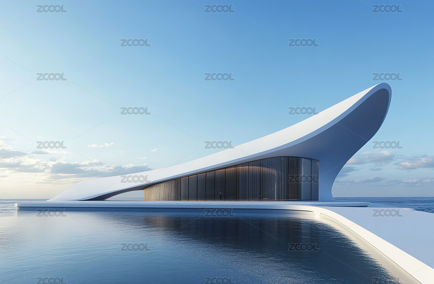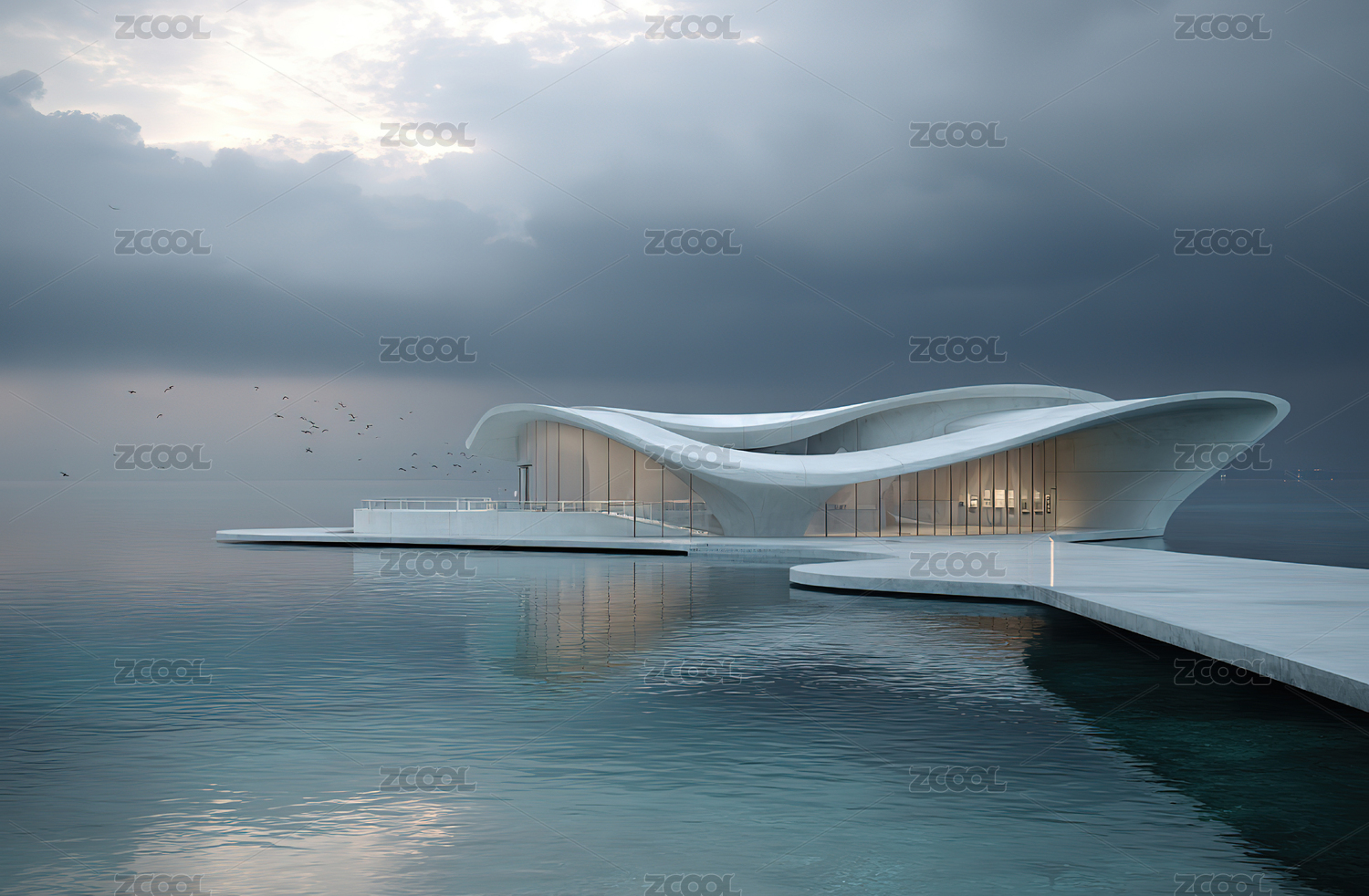 三维立体,3D,水,AI数字艺术,AIGC,建筑,夜景,现代,风格,海边