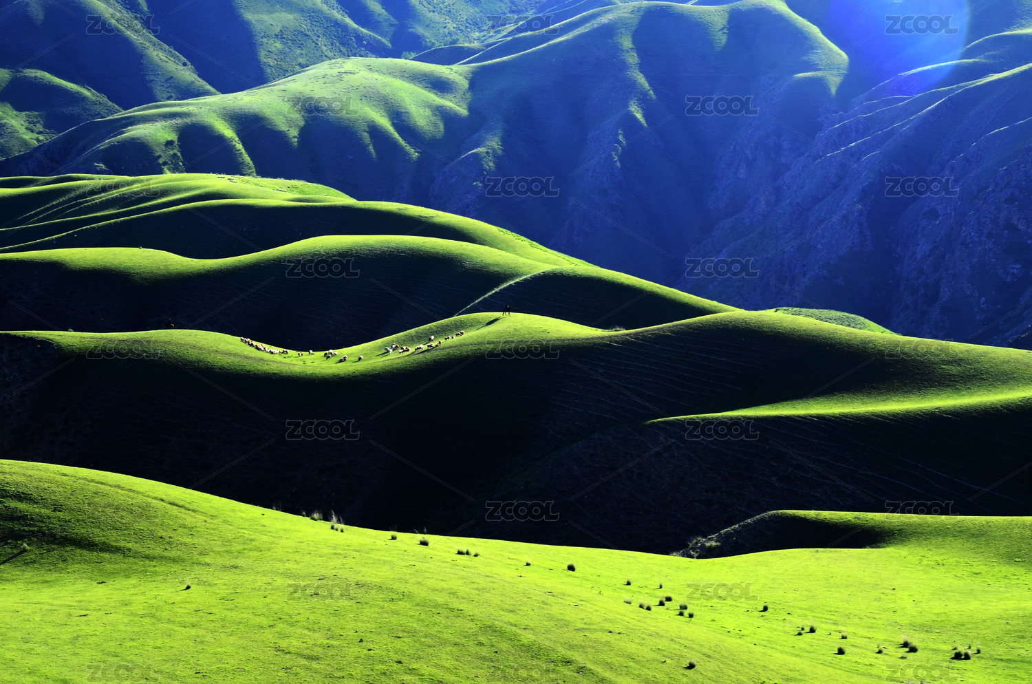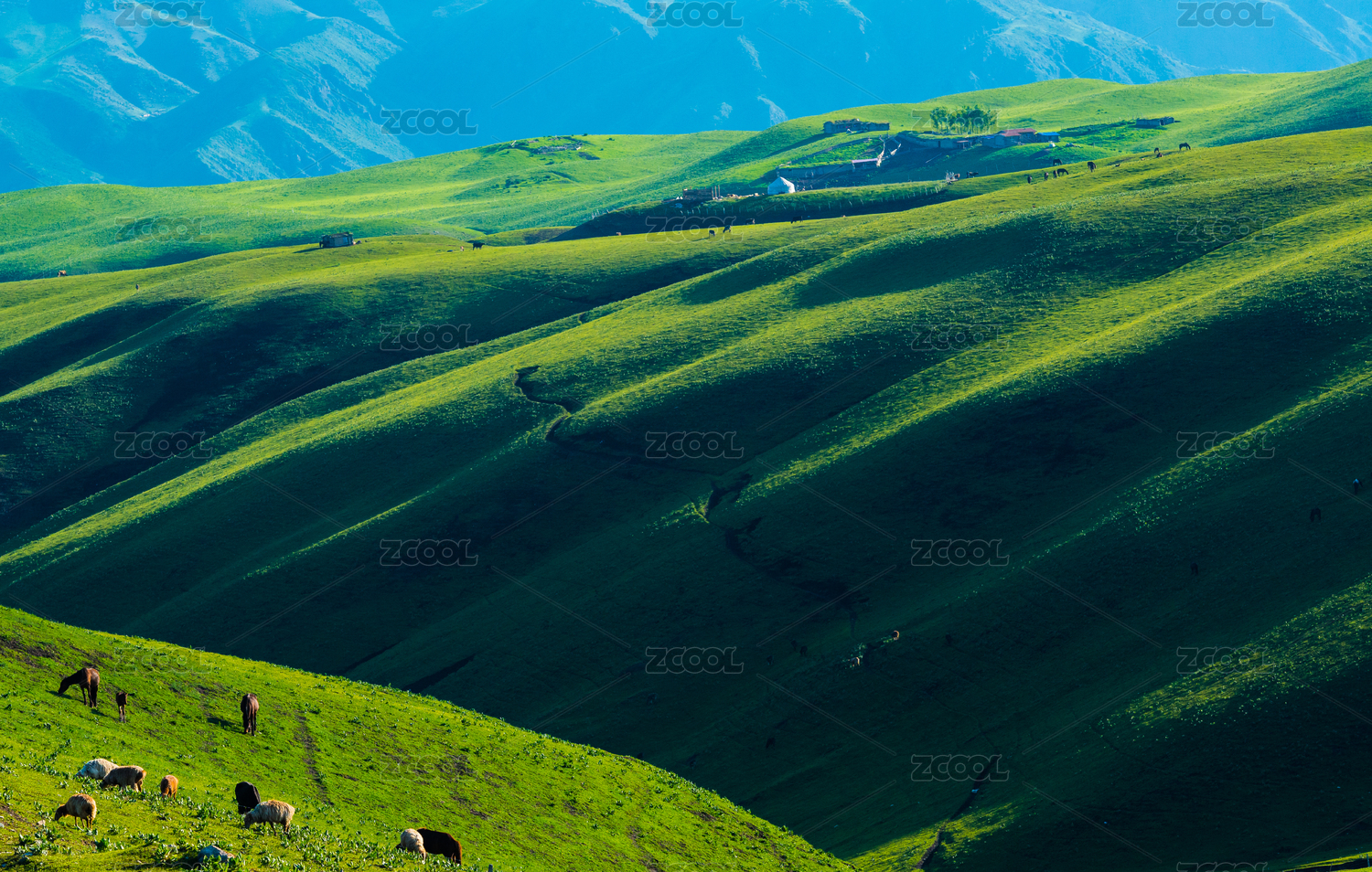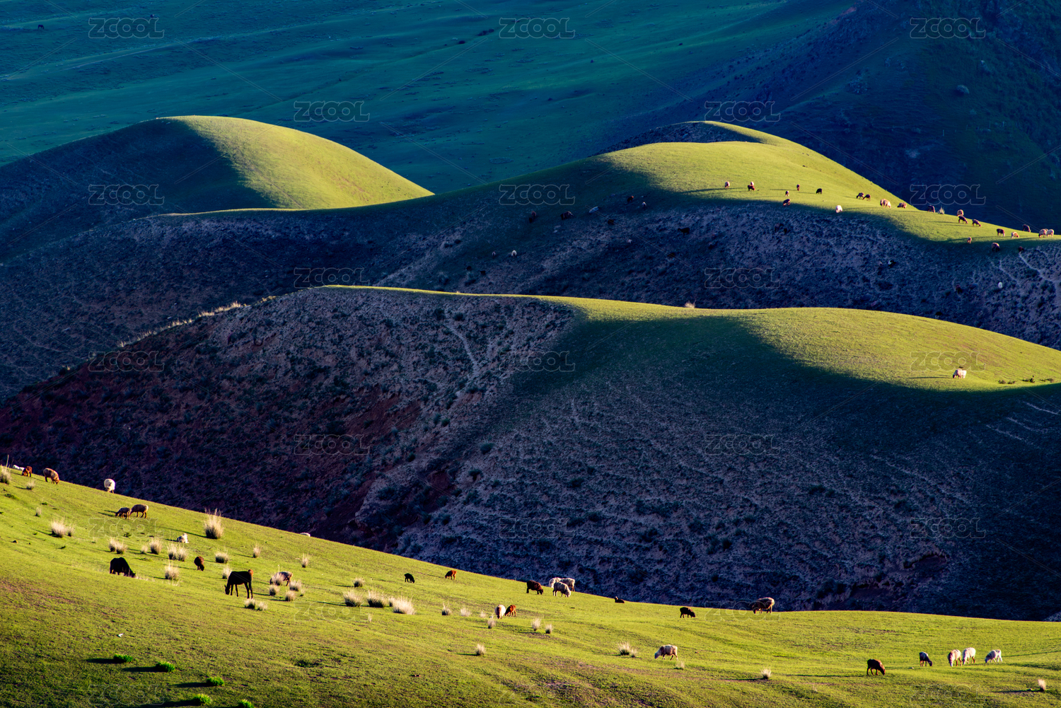 中国新疆起伏绿色草原放牧
