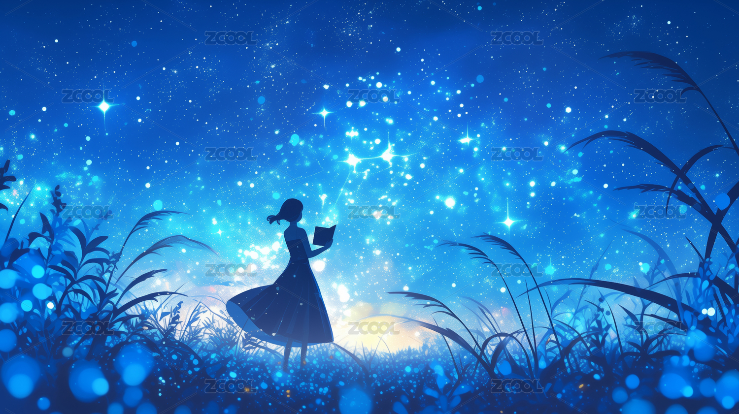 撑伞的少女欣赏夜空的流星雨深蓝色唯美插画
