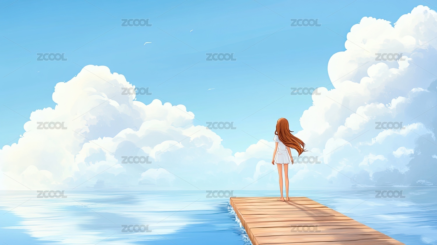 女孩在蓝天白云中飞翔,唯美动漫风通用插画