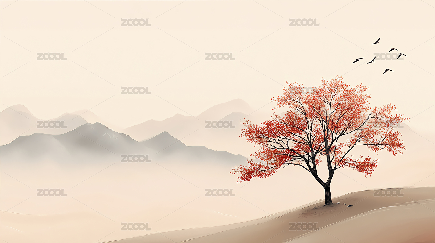 背景, 山峰, 自然, 山水画, 水彩, 装饰画, 壁画,沙漠, 古建筑, 飞鸟
