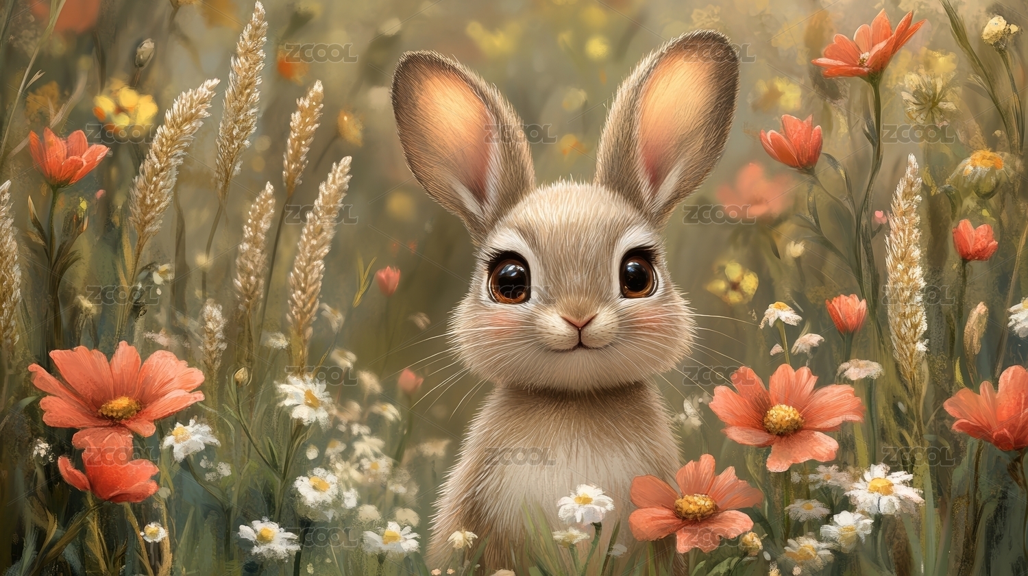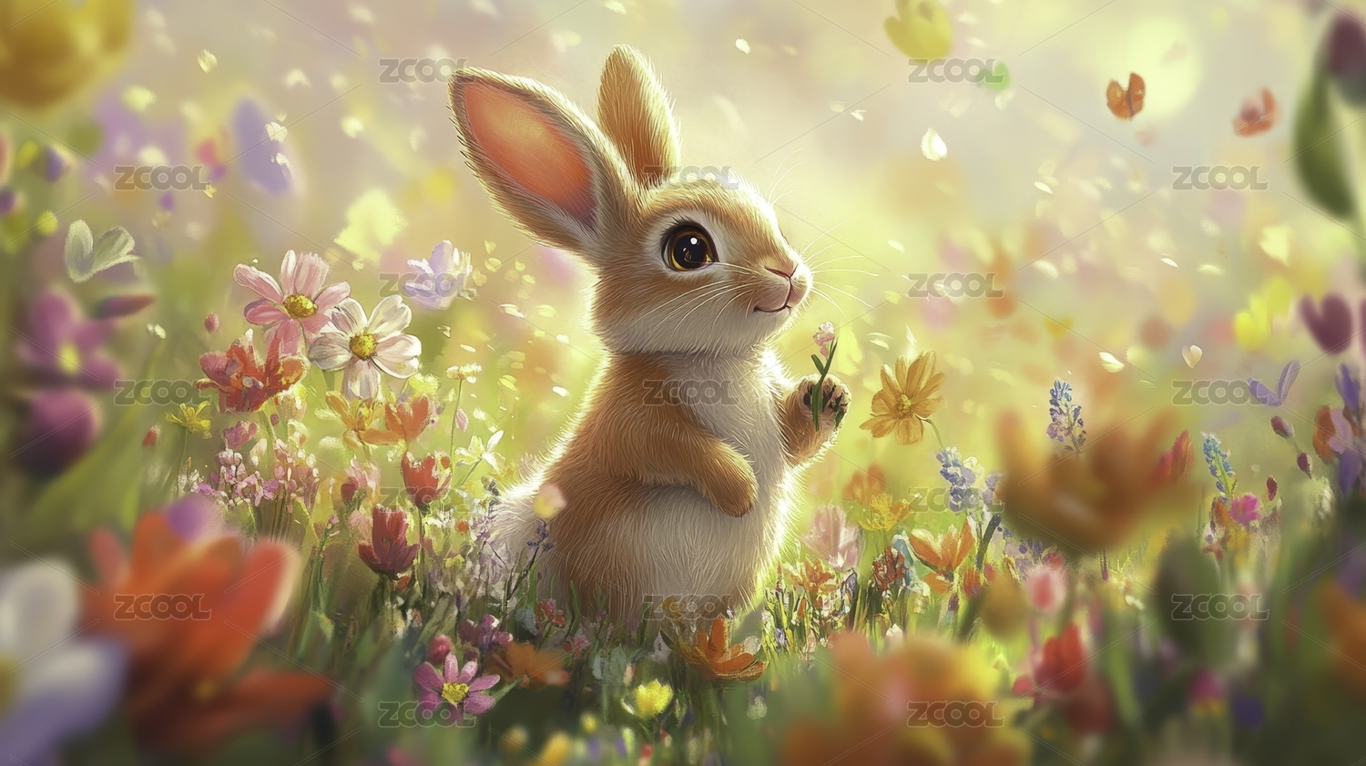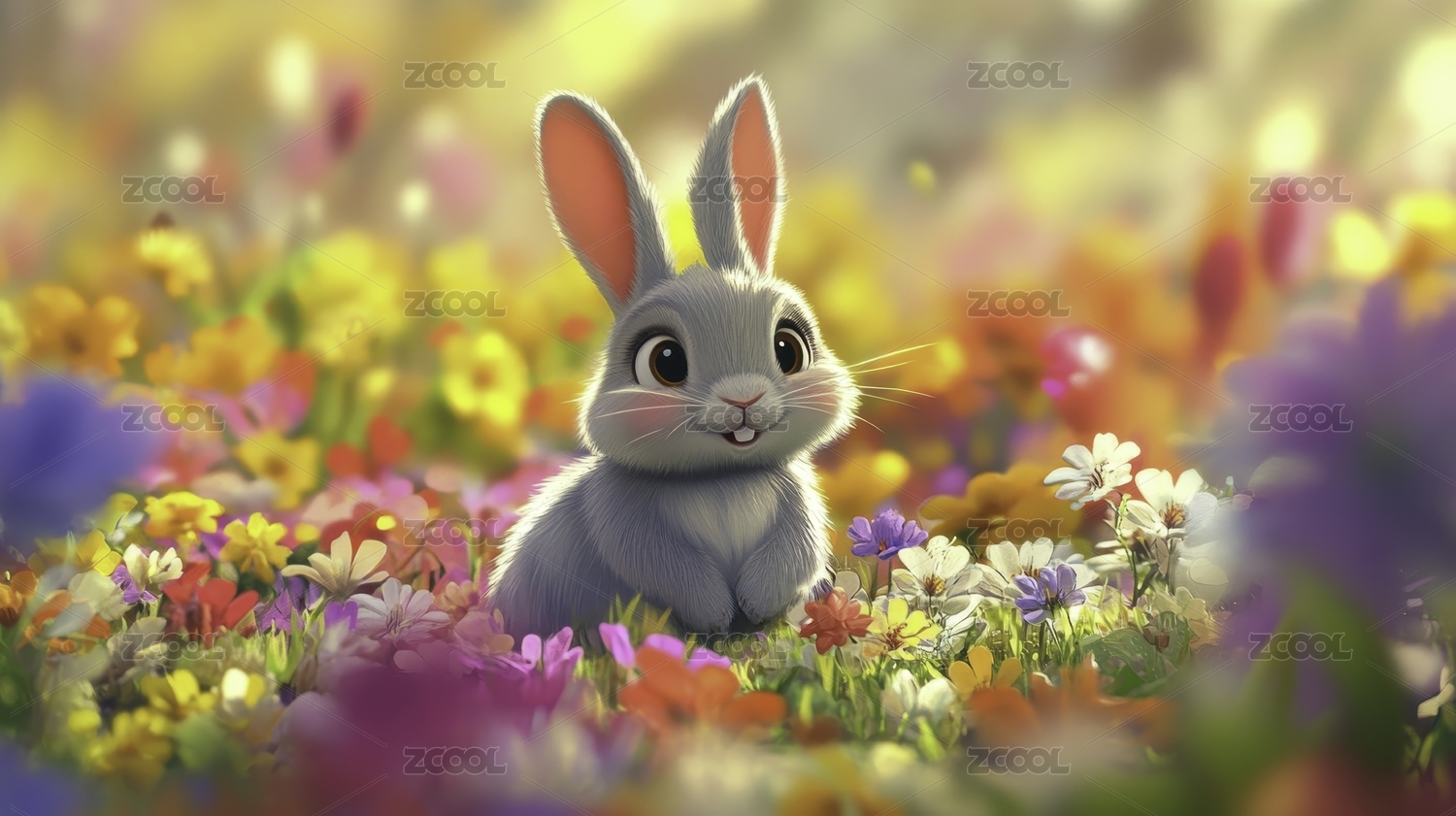 一只小兔子在黄昏的草丛中,3D卡通插画