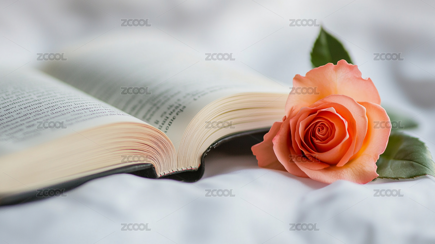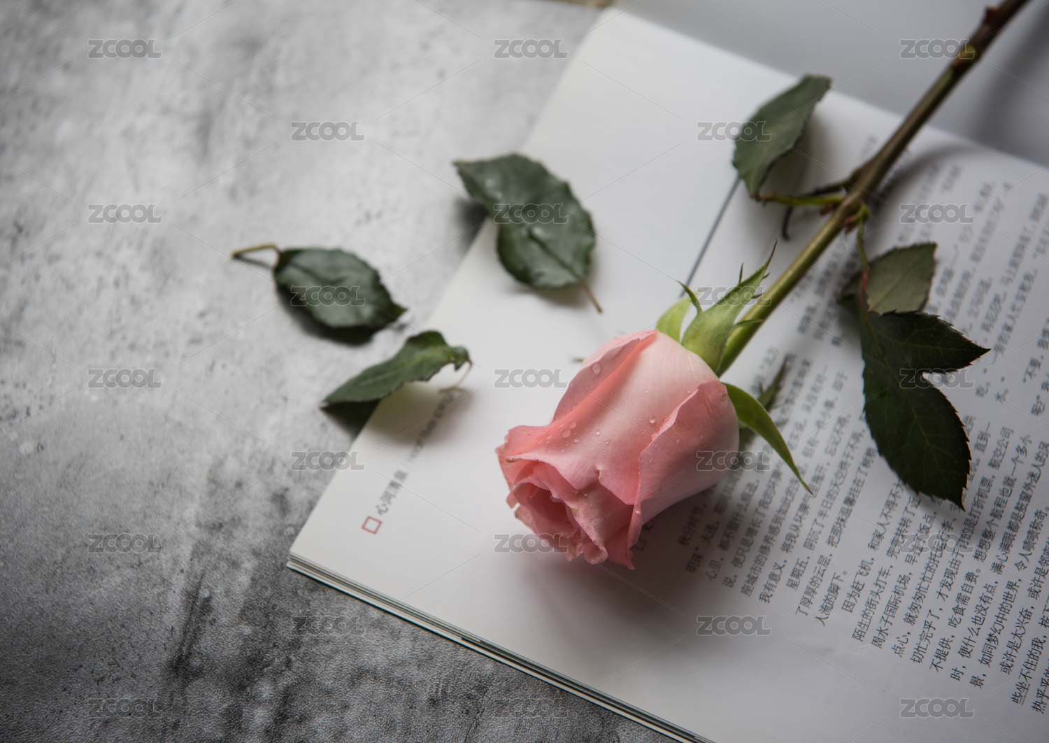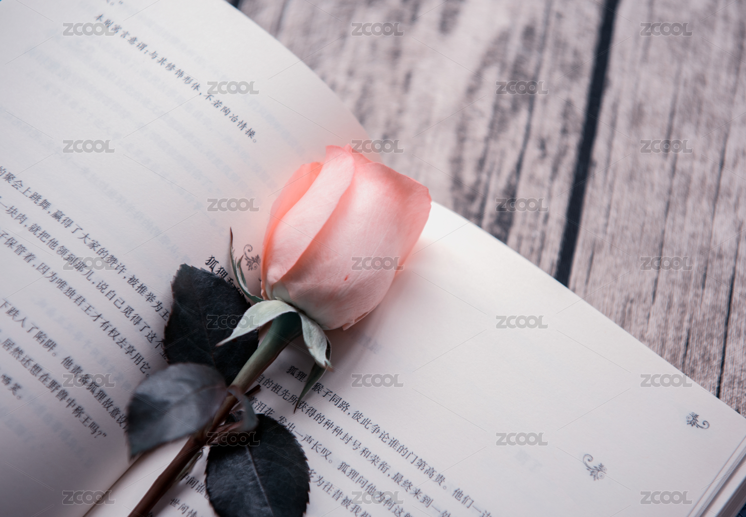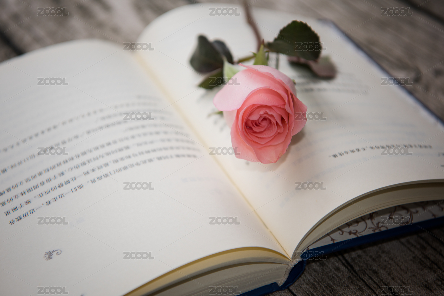 一本打开的书本上放着一朵粉红色的盛开的玫瑰花