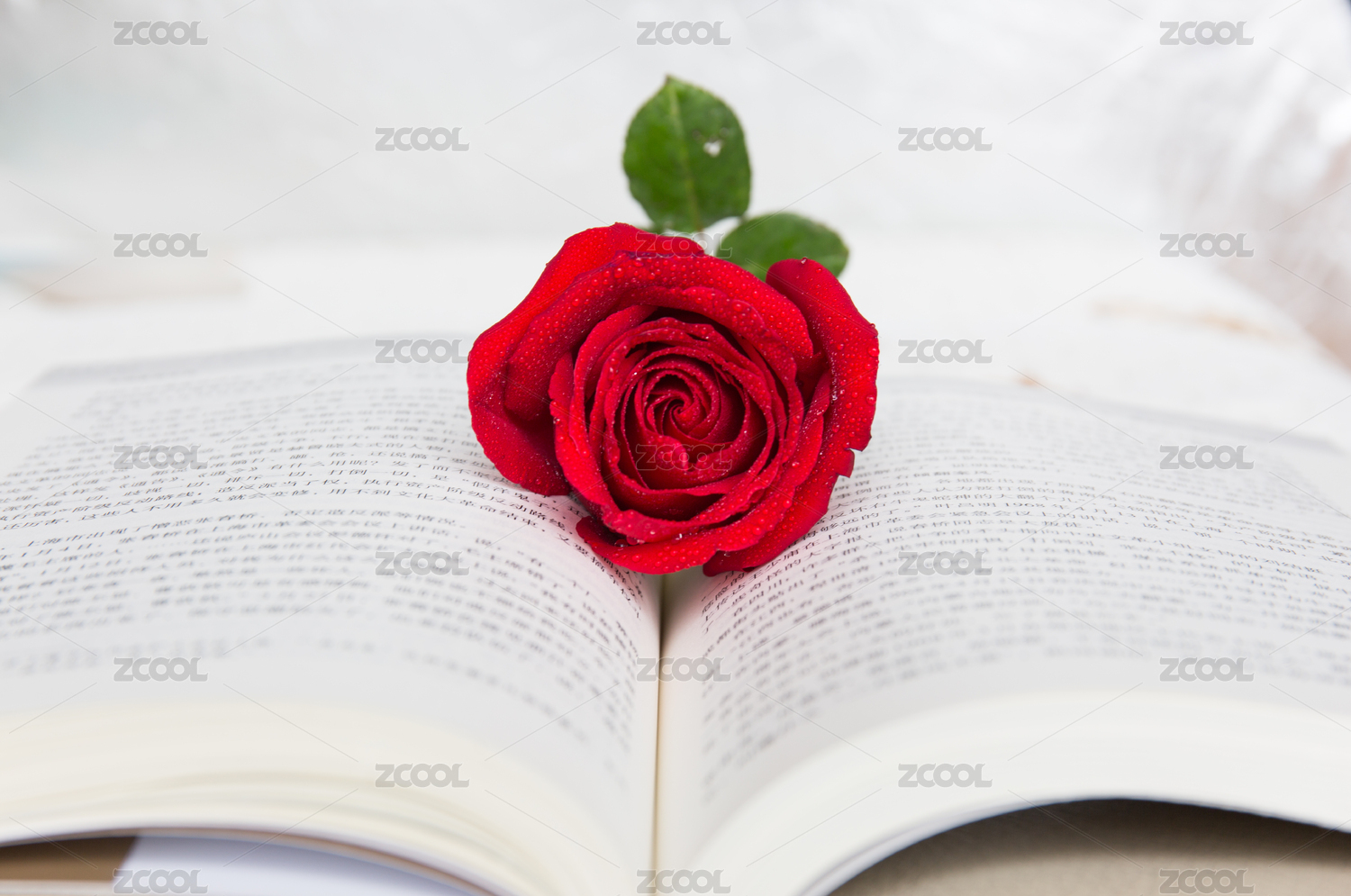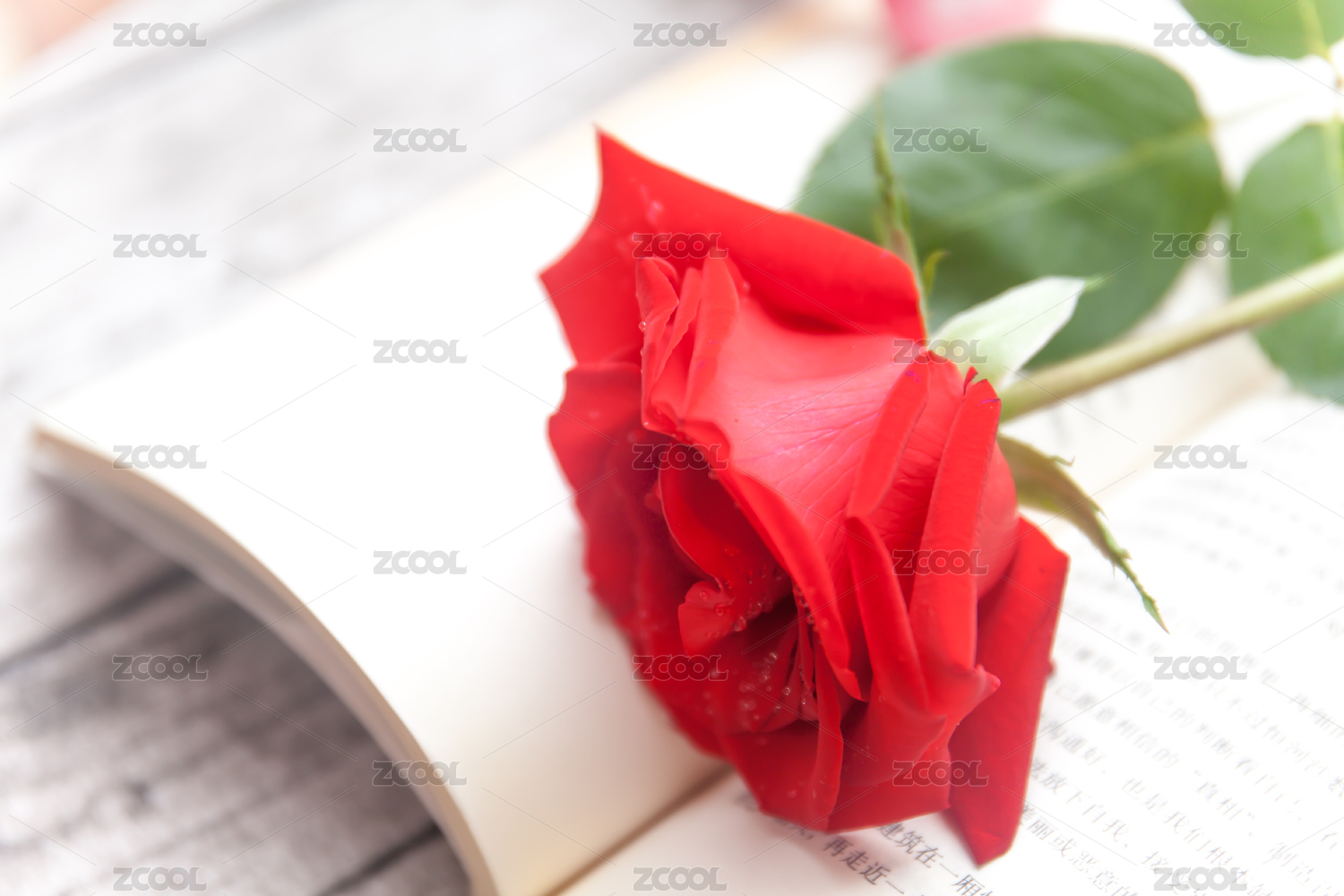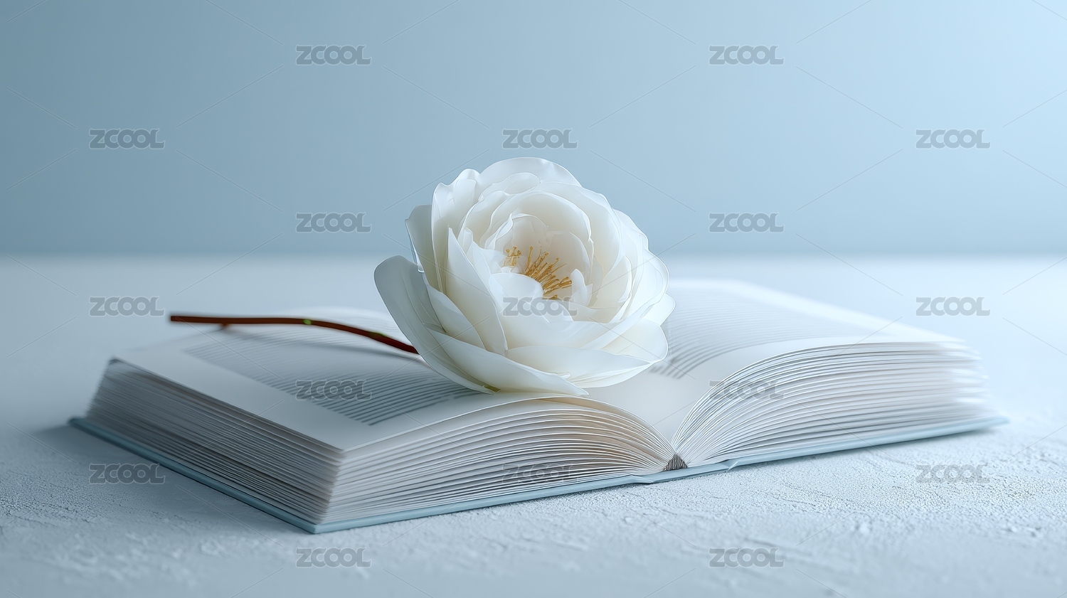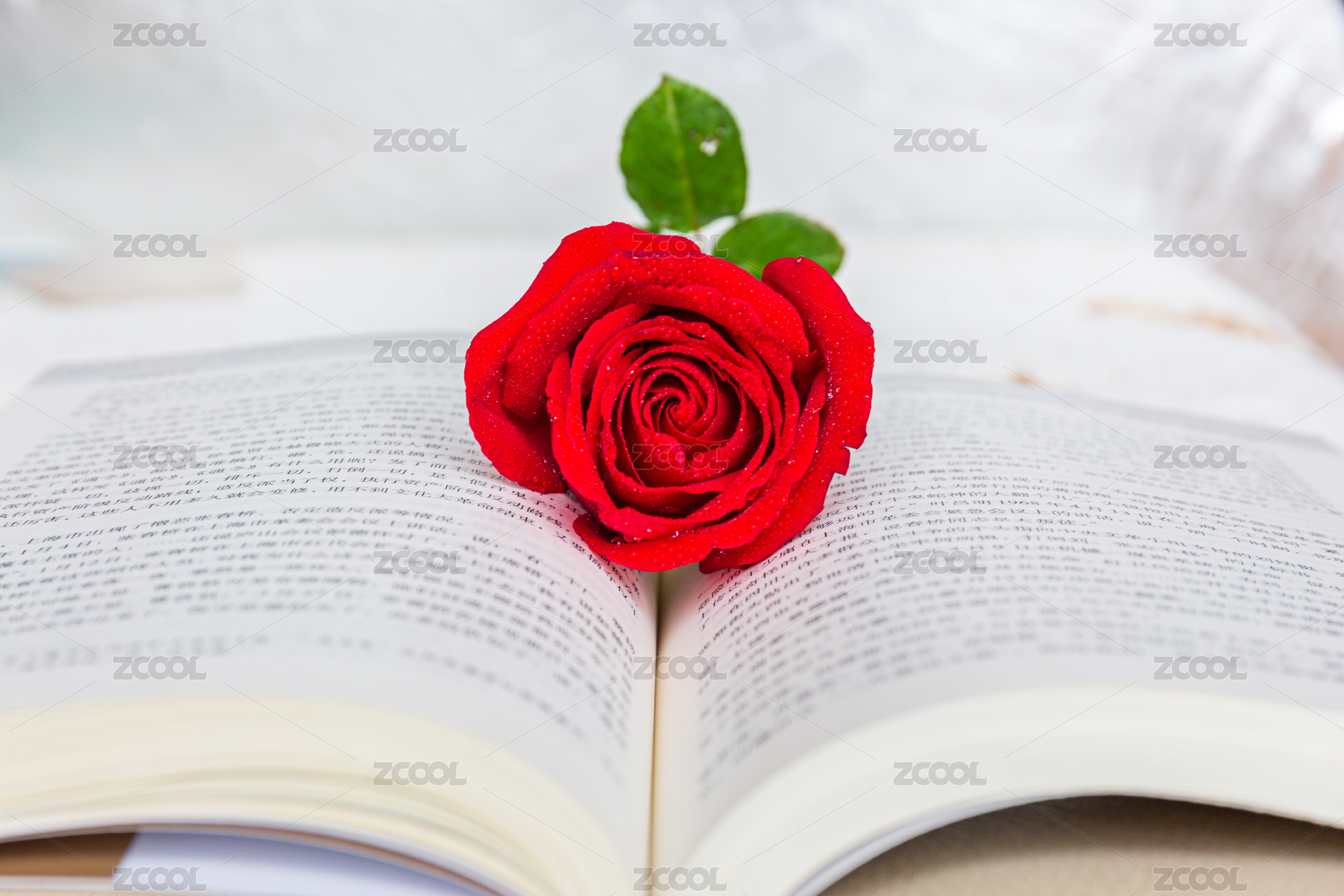 一本打开的书本上放着一朵粉红色的盛开的玫瑰花