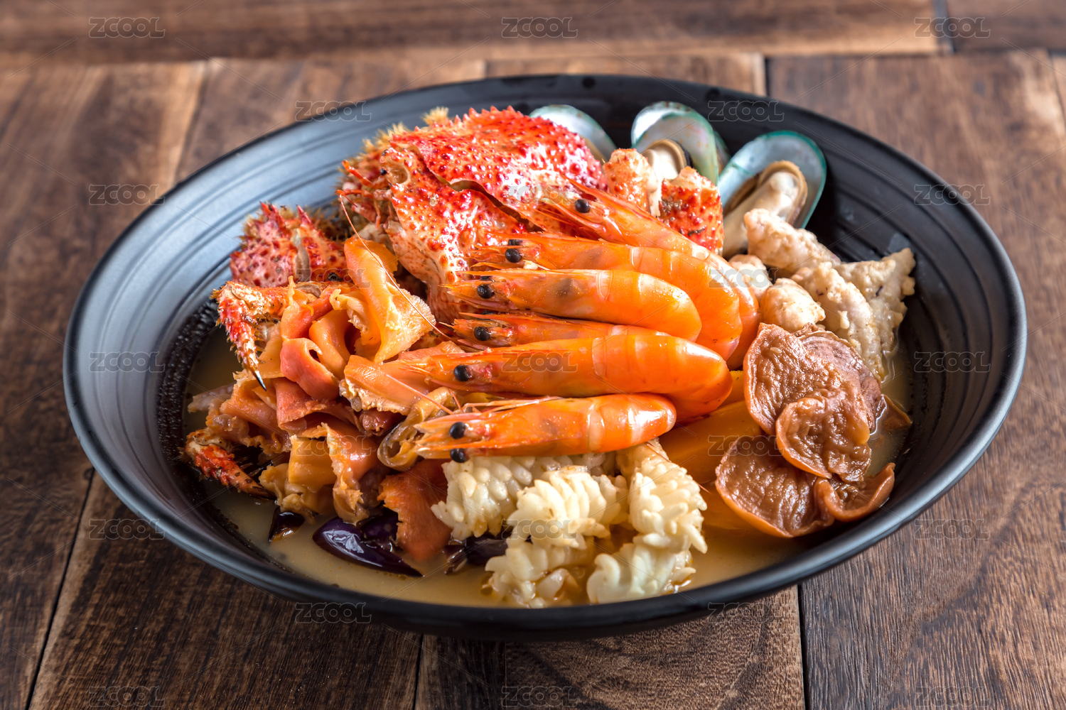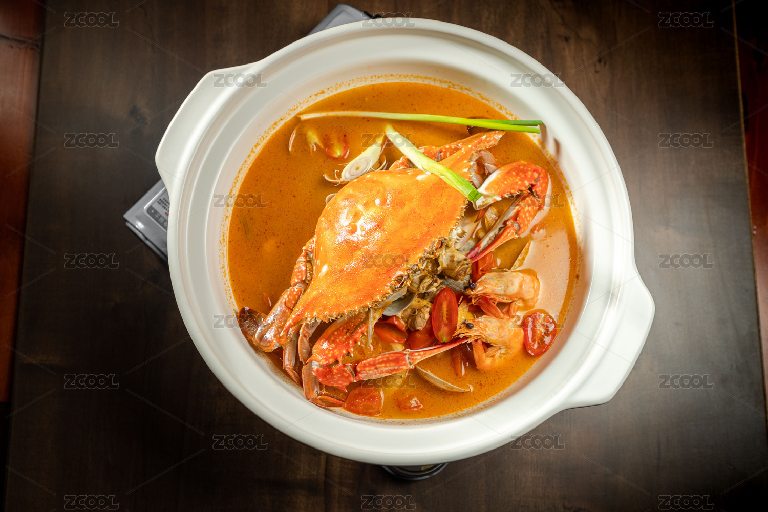 棕色木纹桌上放着一碗冬阴功炖蟹打边炉