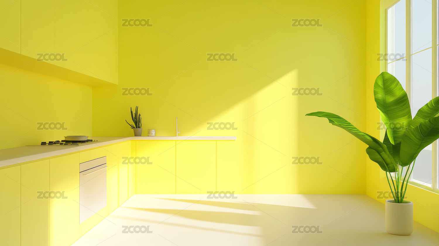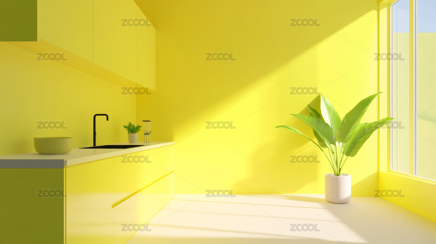 3D电商场景设计,厨房桌面台面特写,最佳品质,3D渲染,绿色墙面,清新,整洁