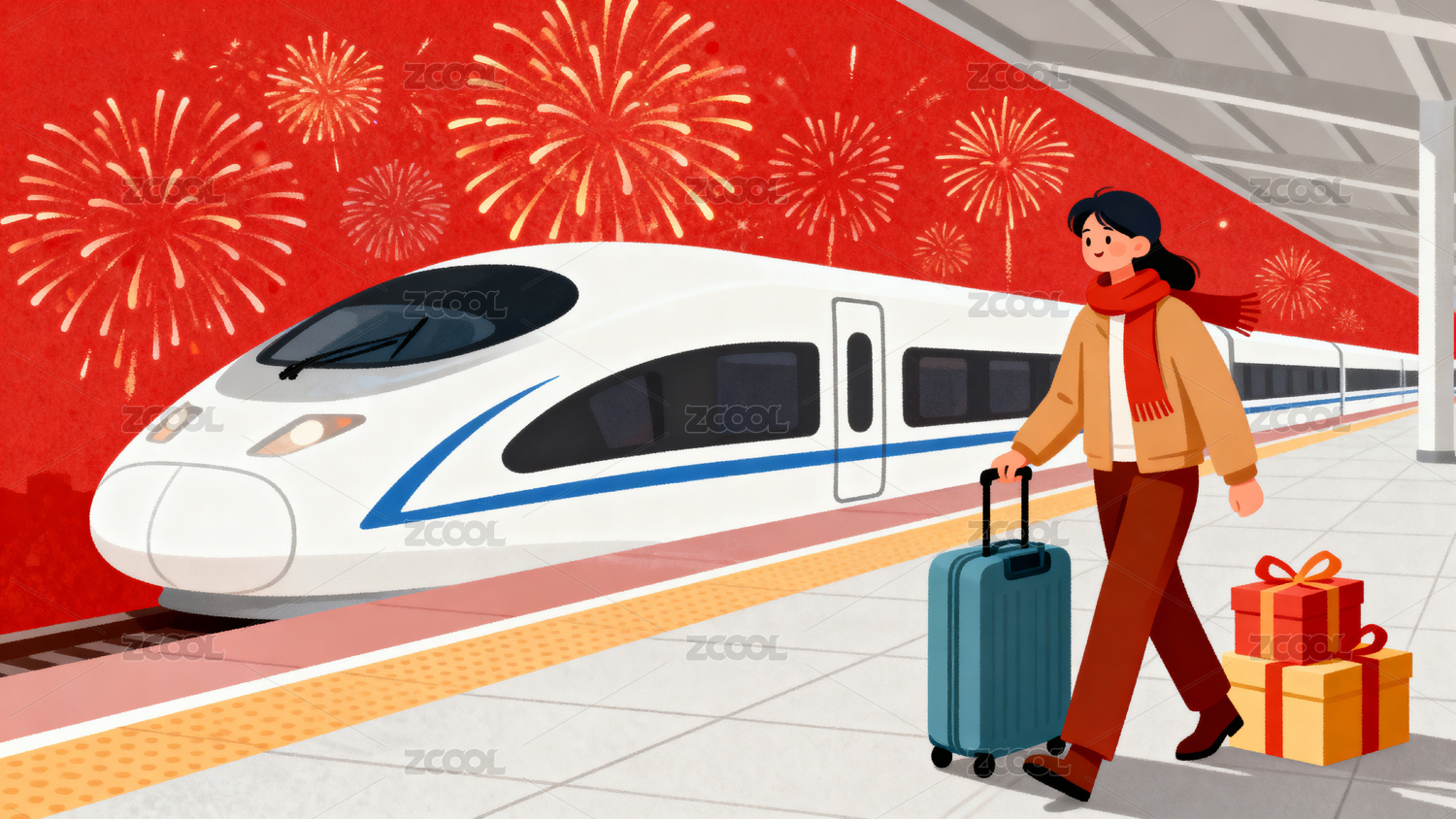 卡通手绘春运火车高铁动车春节返乡回家插画
