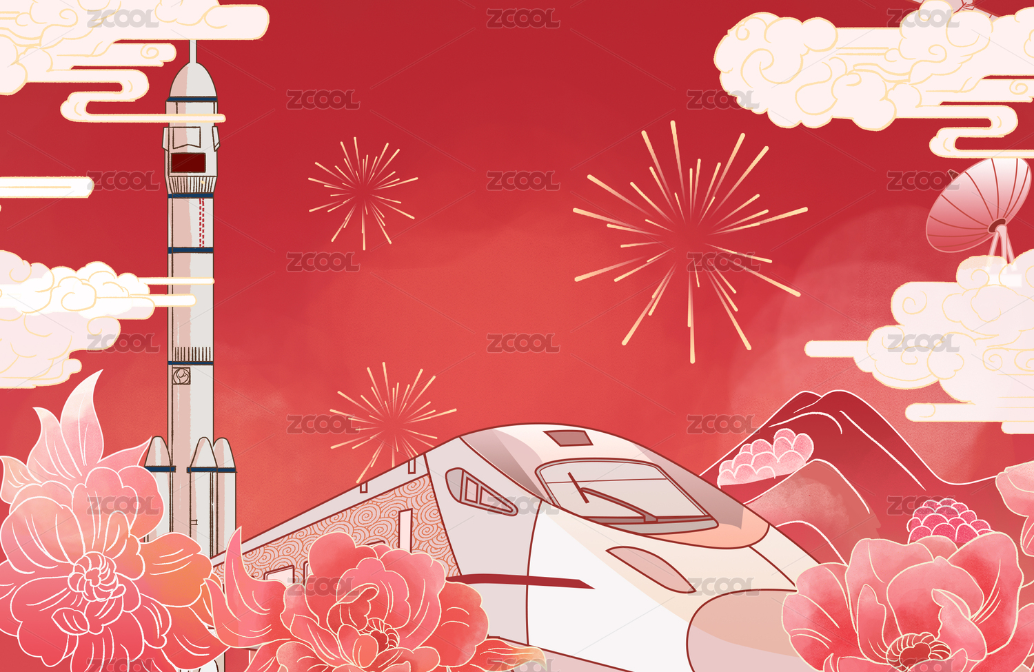 国庆节日腾飞速度高铁火箭长城花朵烟花