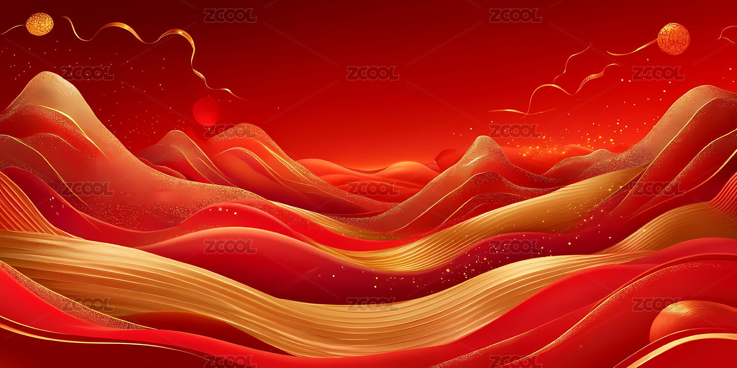 红色波浪山峦与金色丝带