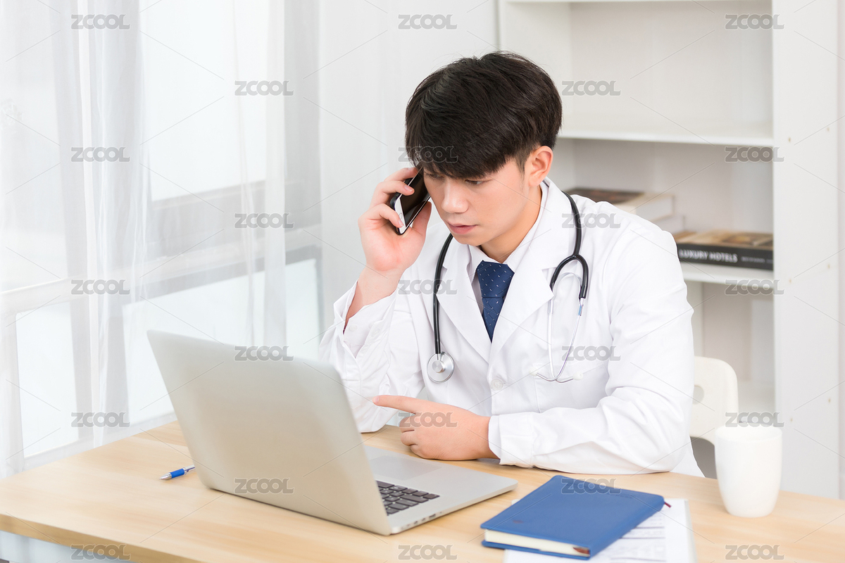 坐在办公室里正在进行电话问诊的亚洲男医生