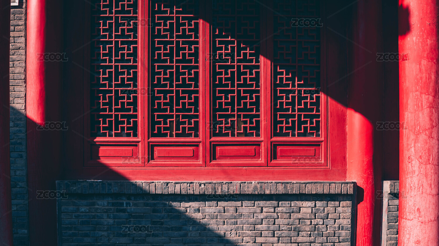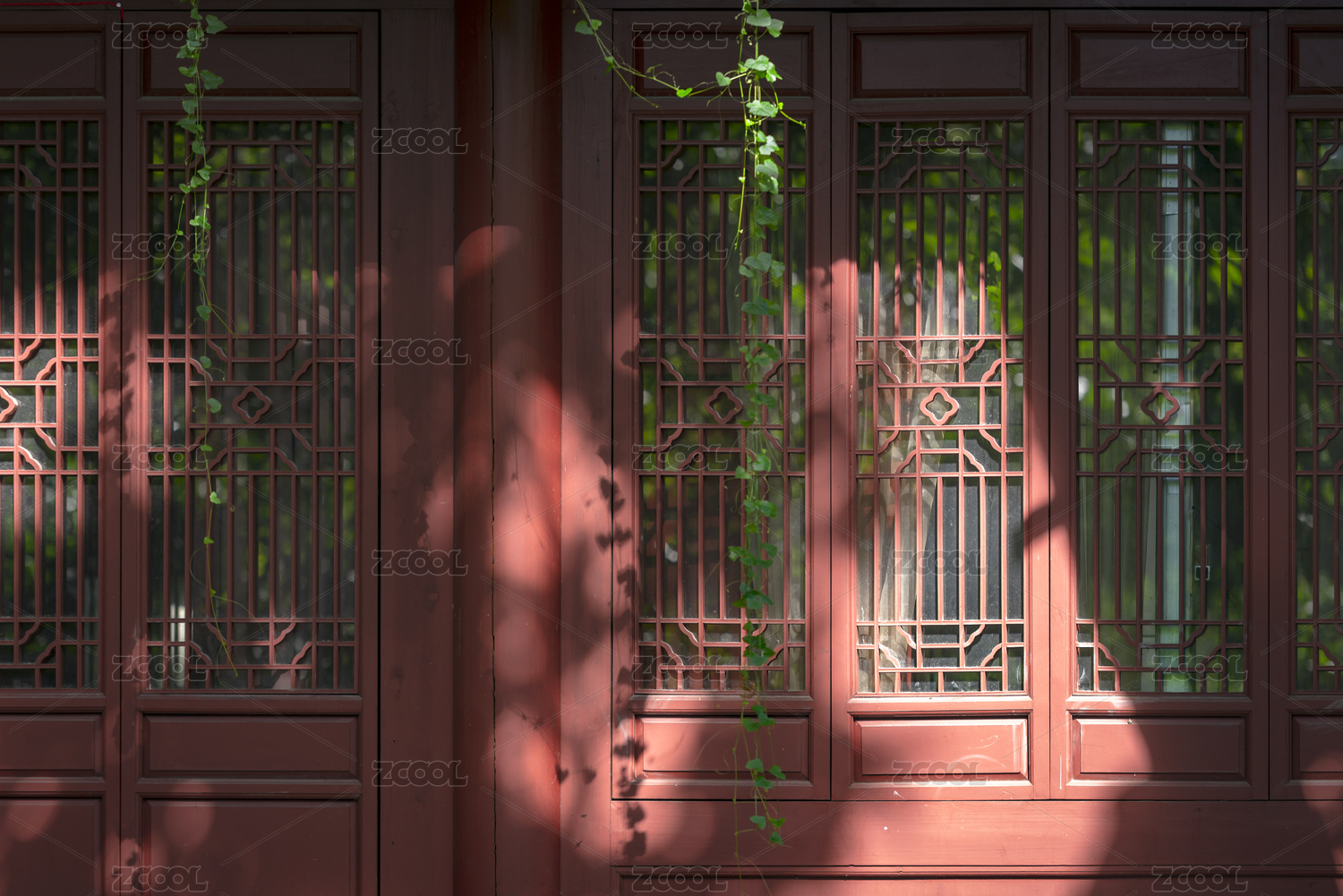绿色藤本植物垂吊在光影斑驳的红木门前