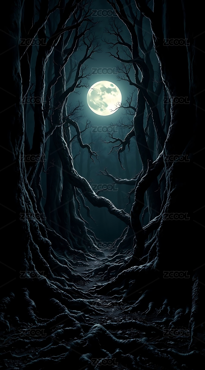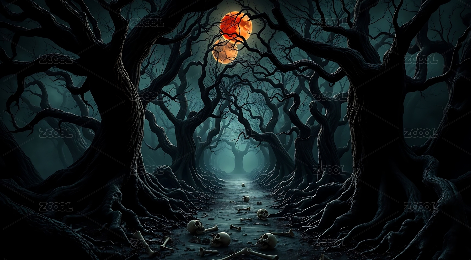 万圣节,森林,树木,夜晚,神秘,黑暗,诡异,插画,恐怖,树林