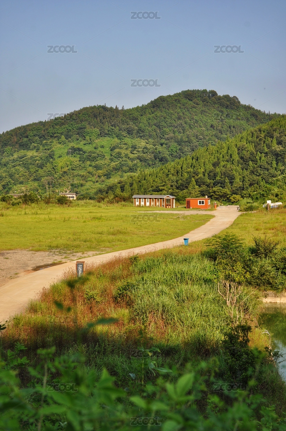水稻田中间的一条水泥路及远处的民房,中国福建永定