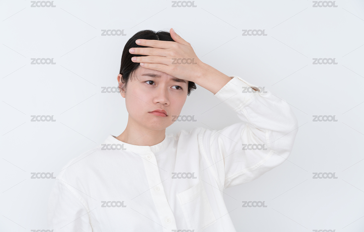 一个亚洲女人摸着自己的疼痛头痛头疼的脑袋,感觉很难受很烦躁