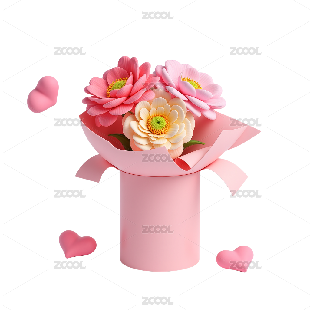 3D情人节粉色卡通爱心玫瑰花礼盒元素