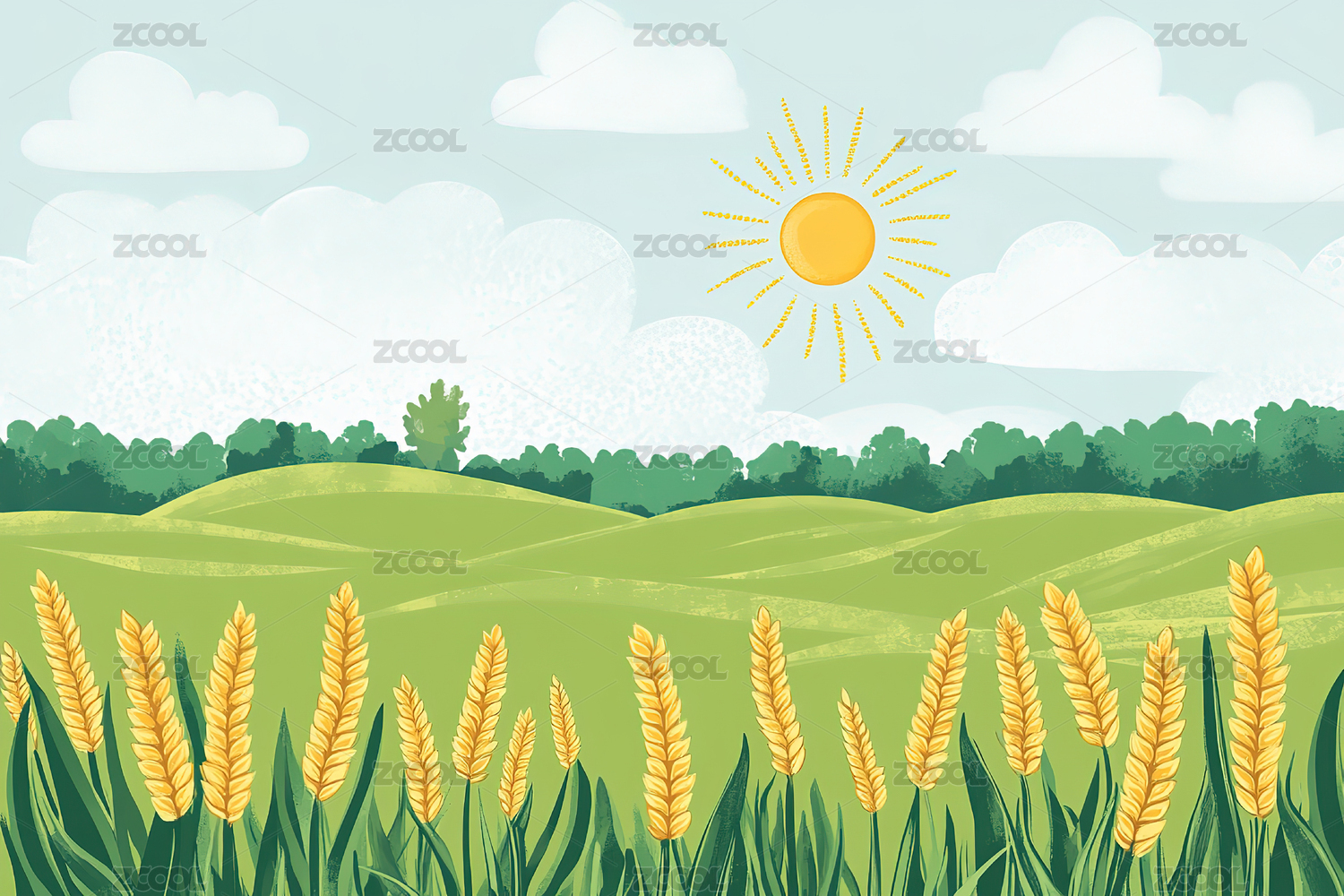 夏天晴朗天空下成熟的金黄色麦田插画绘画