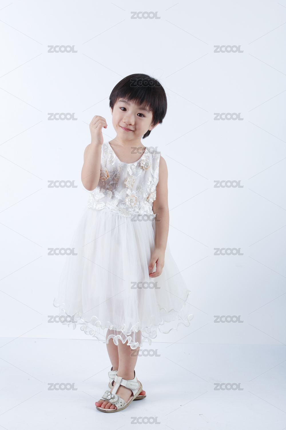 中国女宝宝穿白色裙子拿着花