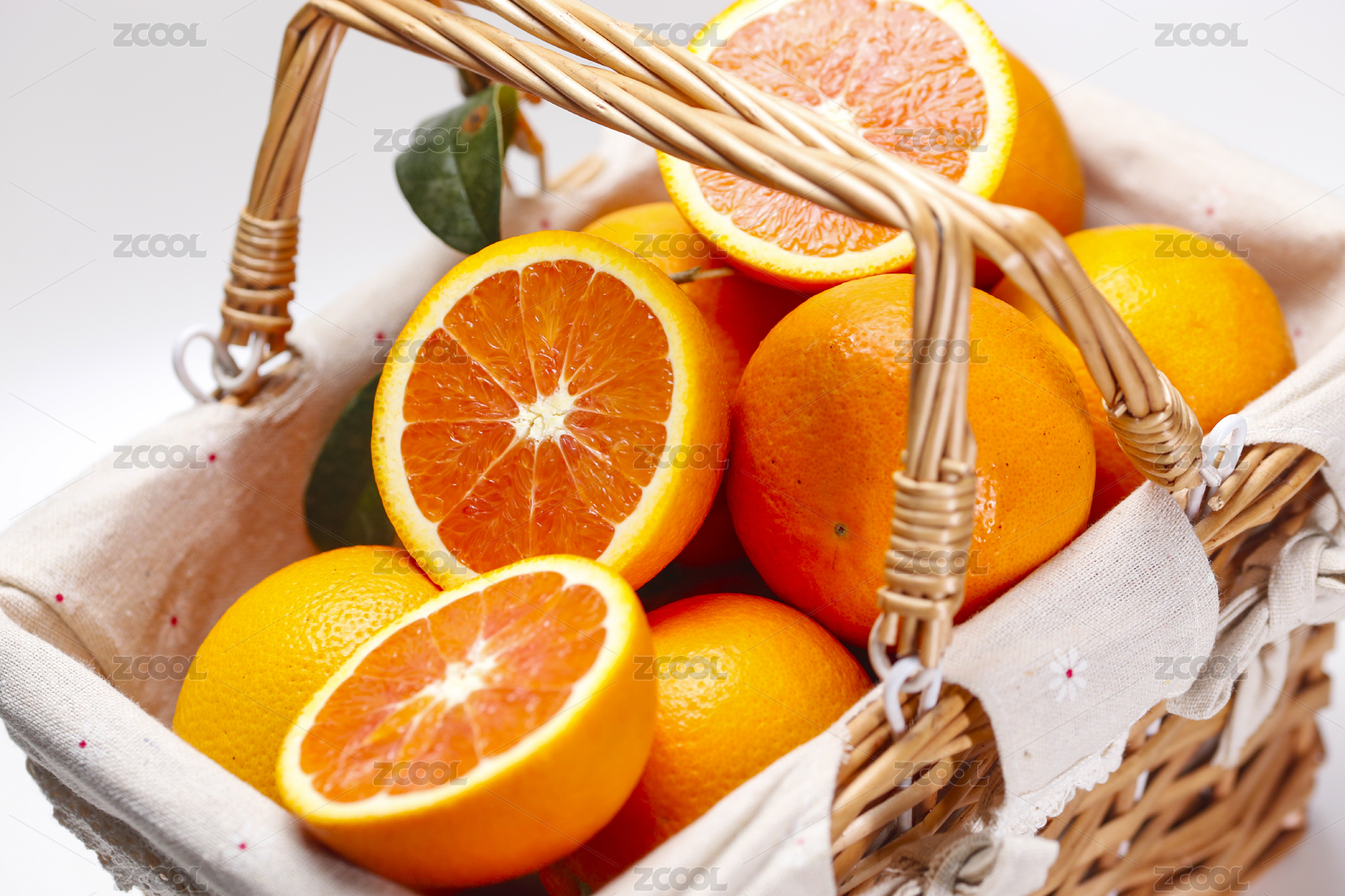 白底上放着一筐子脐橙和脐橙切面