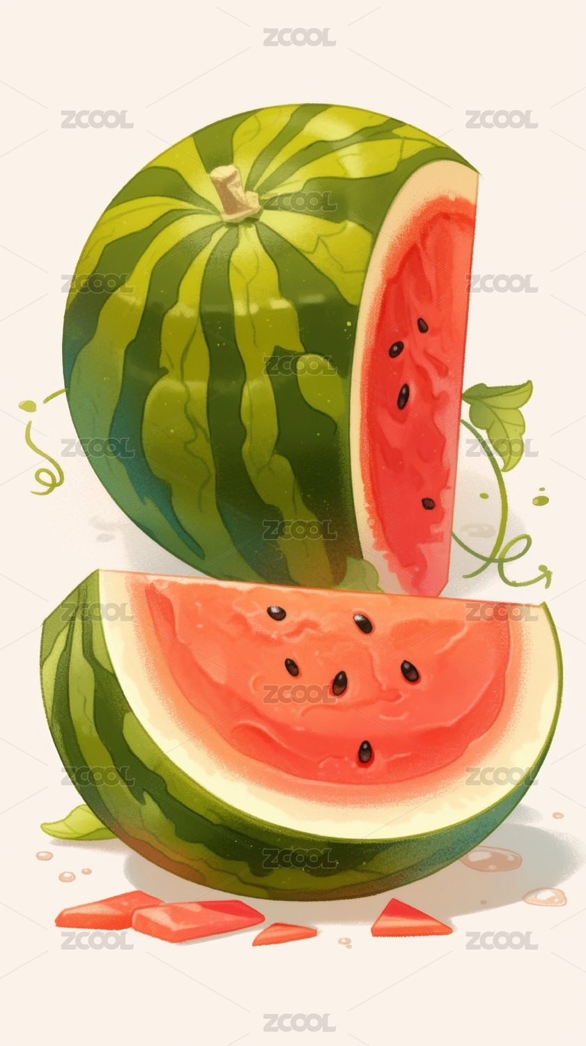 夏天清爽西瓜插画,立夏节气西瓜美食场景插